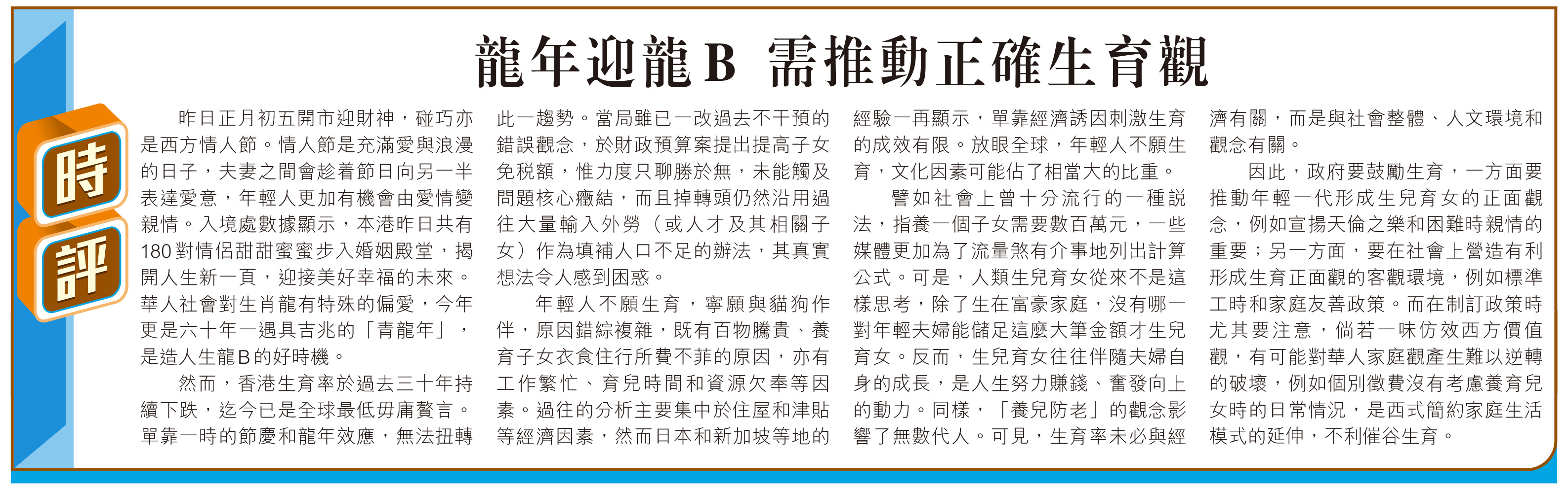 然而,香港生育率於過去三十年持續下跌,迄今已是全球最低毋庸贅言。單靠一時的節慶和龍年效應,無法扭轉此一趨勢。當局雖已一改過去不干預的錯誤觀念,於財政預算案提出提高子女免稅額,惟力度只聊勝於無,未能觸及問題核心癥結,而且掉轉頭仍然沿用過往大量輸入外勞(或人才及其相關子女)作為填補人口不足的辦法,其真實想法令人感到困惑。