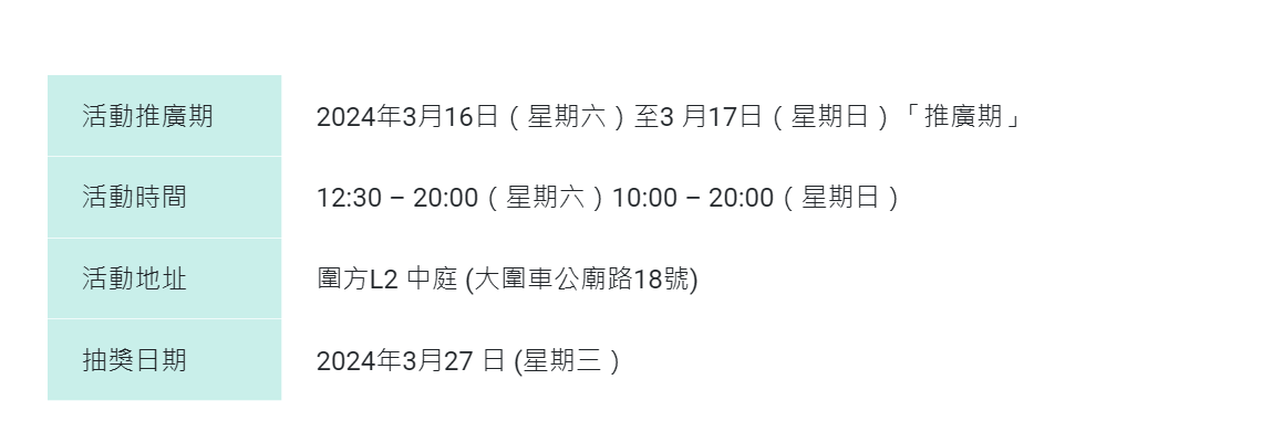 消費權益嘉年華將於3月16至17日,一連兩天於大圍圍方舉行。參加者既可於精心設計的消費棋盤上游走挑戰有獎問答遊戲,亦可去參加攤位遊戲鬥智鬥力,完成消費者任務過關,換取精美禮品,包括50周年限定版環保袋、消費權益飛行棋、輕食木餐具套裝、保溫瓶等近7,000份。