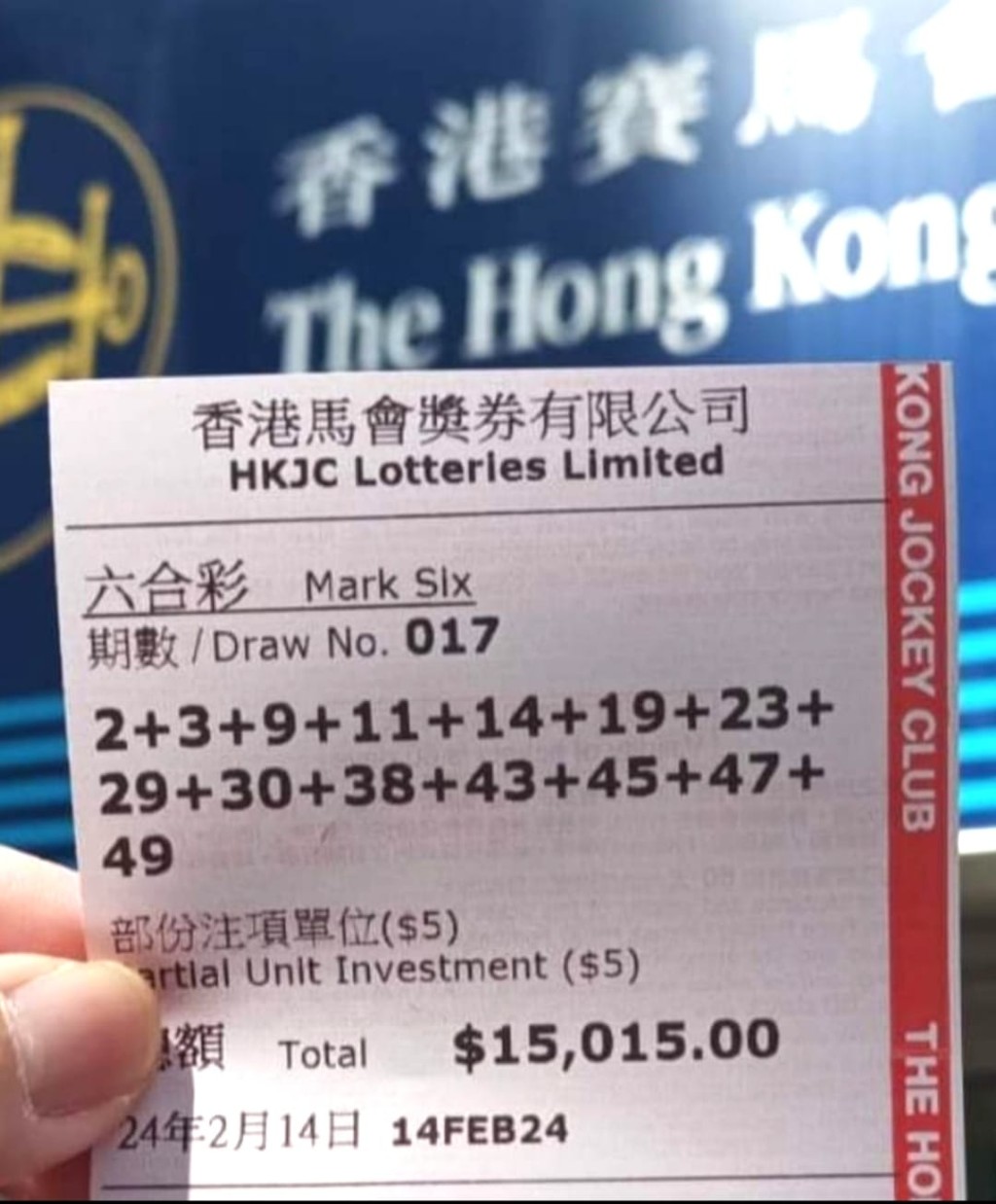 成為億萬富翁是不少人的心願,不少市民前往投注站或線上購入彩票。有港男事後於社交平台分享自己的六合彩彩票,顯示他以半注5元購買2、3、9、11、14、19、23、29、30、38、43、45、47及49,合共14個號碼,總投注金額更高達15015元。惟新春金多寶攪出的幸運號碼為:10、12、13、24、25、48,特別號碼為:15。