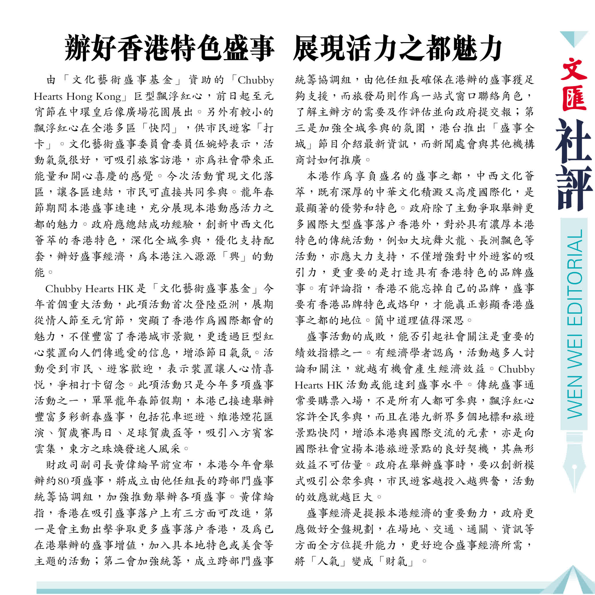 由「文化藝術盛事基金」資助的「Chubby Hearts Hong Kong」巨型飄浮紅心,前日起至元宵節在中環皇后像廣場花園展出。另外有較小的飄浮紅心在全港多區「快閃」,供市民遊客「打卡」。文化藝術盛事委員會委員伍婉婷表示,活動氣氛很好,可吸引旅客訪港,亦為社會帶來正能量和開心喜慶的感覺。今次活動實現文化落區,讓各區連結,市民可直接共同參與。龍年春節期間本港盛事連連,充分展現本港動感活力之都的魅力。政府應總結成功經驗,創新中西文化薈萃的香港特色,深化全城參與,優化支持配套,辦好盛事經濟,為本港注入源源「興」的動能。