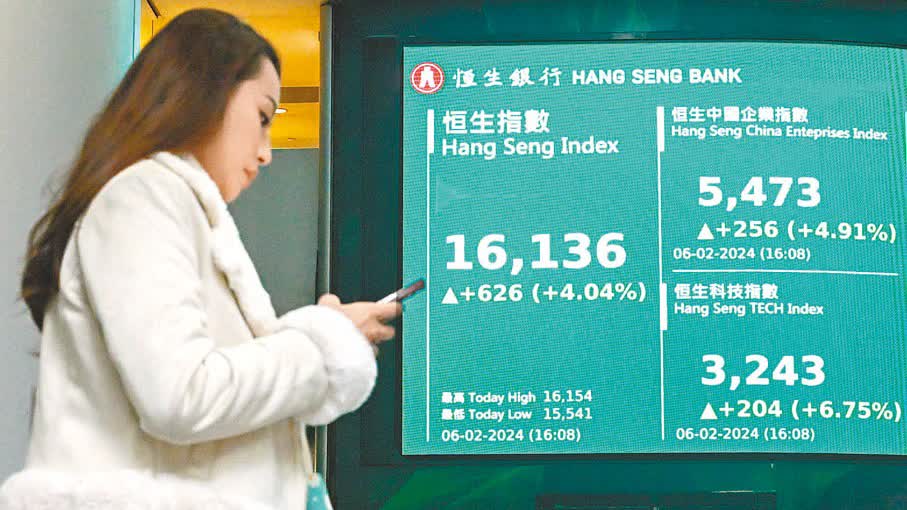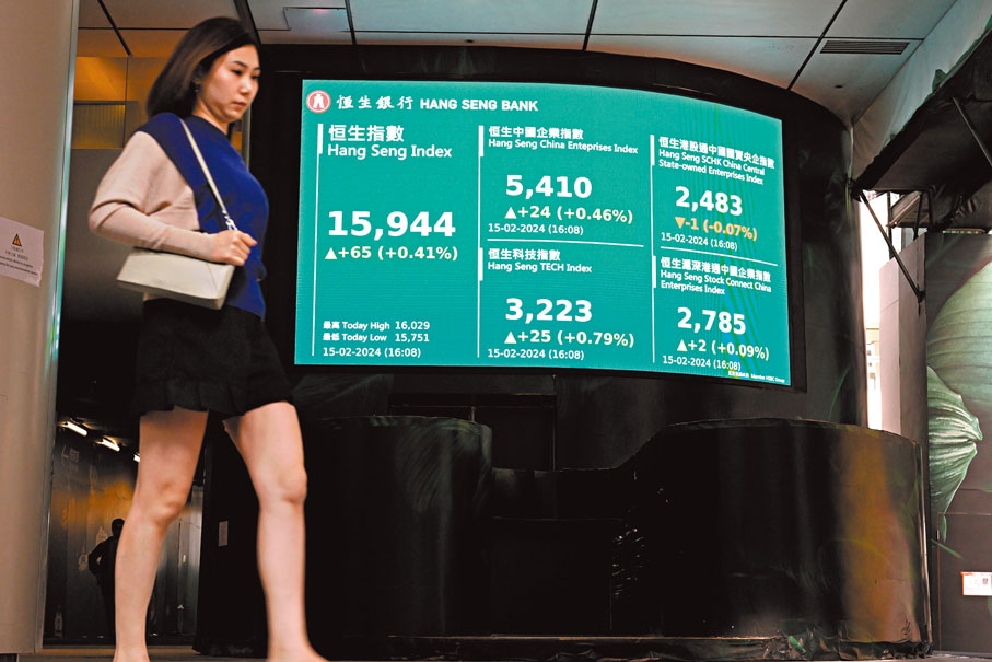 (香港文匯報記者 周紹基)龍年港股開好局,連升兩日。恒指昨一度重上16,000點大關,最終收報15,944點,升0.41%,龍年首兩個交易日累升1.26%。瑞銀財富管理亞太區投資總監辦公室發表「龍年投資中國報告」,預計中央為強調穩增長決心,在3月初召開的兩會上將再次把經濟增長目標設定在5%左右;短期內,該行建議投資者可考慮偏重防禦性的配置,但如果兩會後,政策有驚喜,便應轉向對宏觀復甦更敏感的成長類股份。