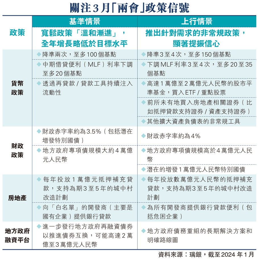 大行瑞銀財富管理亞太區投資總監及宏觀經濟主管胡一帆等團隊,昨發表《龍年攻守兼備,投資穩中有進》的龍年投資中國報告,展望龍年中國的股債市場,並預測3月兩會的政策舉措。該行認為,為強調穩增長決心,預計在3月初召開的兩會上,內地再次將GDP目標設定在5%左右。考慮到基數效應消退,該行認為5%左右這個目標頗具挑戰性,但在基準情景下,適度而必要的寬鬆舉措加碼,將可推動內地的增長率接近這個水平。