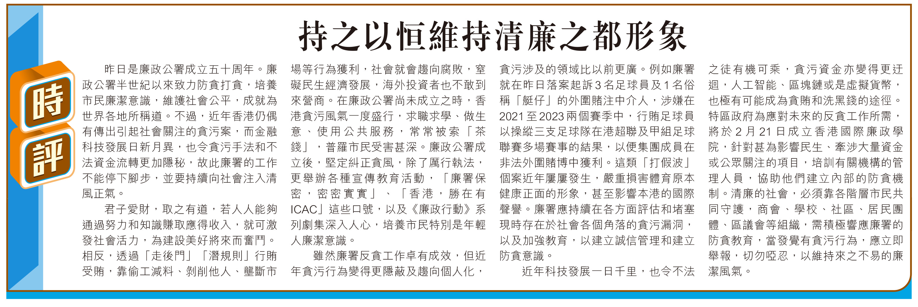 昨日是廉政公署成立五十周年。廉政公署半世紀以來致力防貪打貪,培養市民廉潔意識,維護社會公平,成就為世界各地所稱道。不過,近年香港仍偶有傳出引起社會關注的貪污案,而金融科技發展日新月異,也令貪污手法和不法資金流轉更加隱秘,故此廉署的工作不能停下腳步,並要持續向社會注入清風正氣。