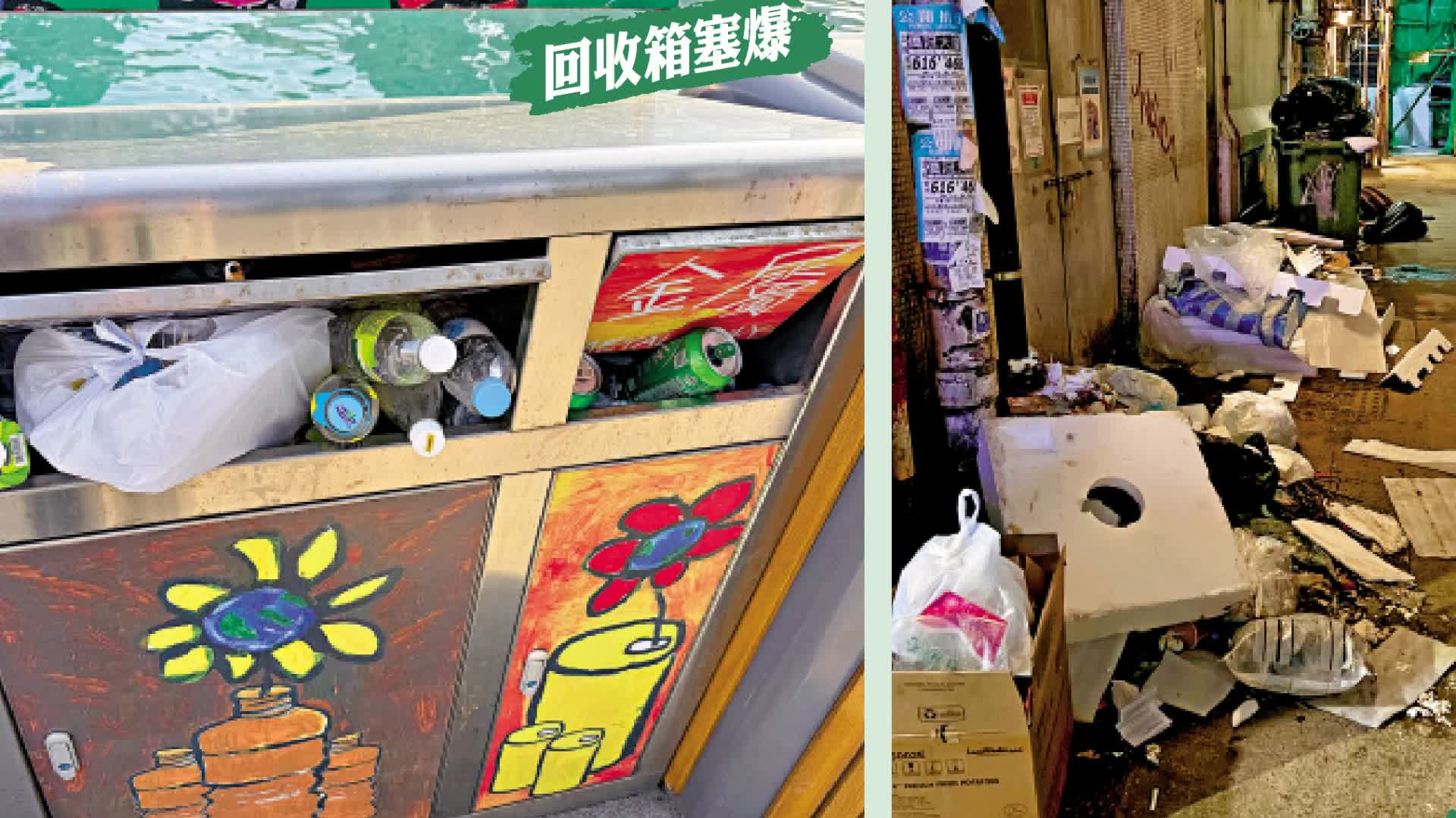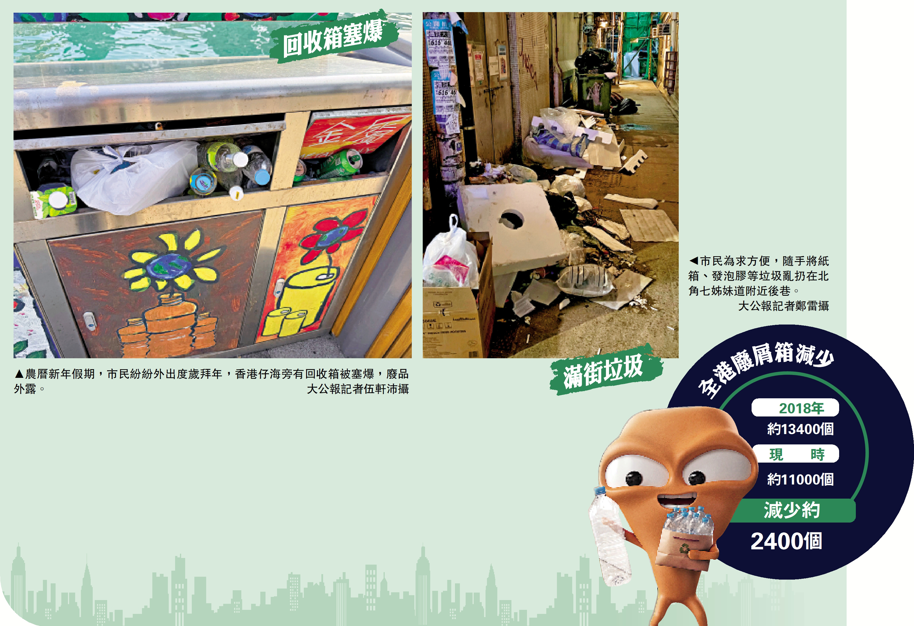 (大公報 記者 伍軒沛、劉碩源)新春期間,拜年與慶祝活動頻繁,街上人潮驟增,垃圾量也隨之上升,但全港垃圾桶減少,回收箱也不足,節後街頭出現大量垃圾。三無大廈更有大量可回收垃圾被棄置,包括可回收的賀年禮物包裝紙盒等。有街道清潔工人表示近來亂拋垃圾嚴重:「不少垃圾是可回收的,卻又被滿街棄置,回收箱不足,加上(市民)嫌麻煩。」