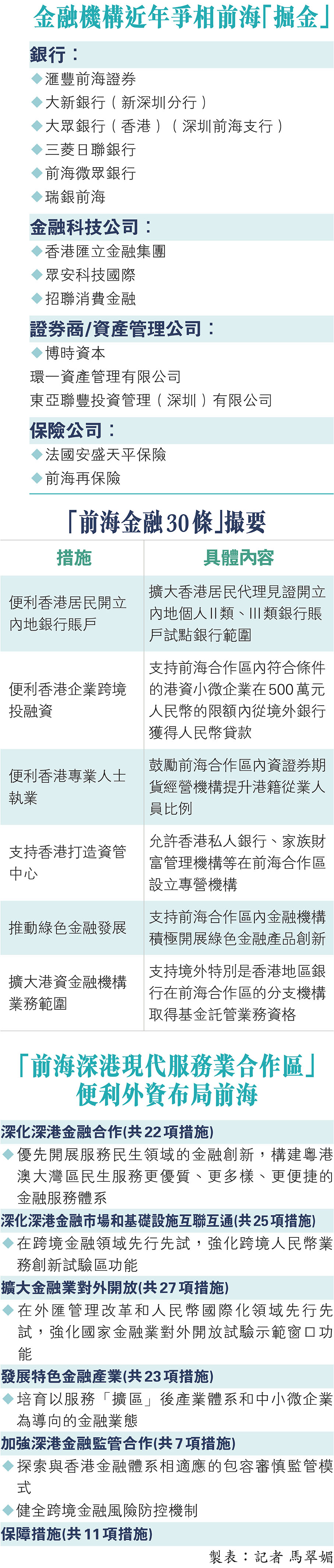 截至2022年,大灣區GDP約1.9萬億美元,足以位列世界最大經濟體行列。因應大灣區核心在於「聯通」,中央政府先後出台不少政策,以提高地區內流通性,推動人才招募,鼓勵合作和投資。內地在2021年9月印發了《全面深化前海深港現代服務業合作區改革開放方案》,當中重點描繪前海金融業擴大對外開放的藍圖,去年2月再頒布「前海金融30條」,同年7月深圳市政府發布《關於貫徹落實金融支持前海深港現代服務業合作區全面深化改革開放意見的實施方案》的通知,以貫徹落實「前海金融30條」中包括民生金融、跨境金融服務等30項便利措施。
