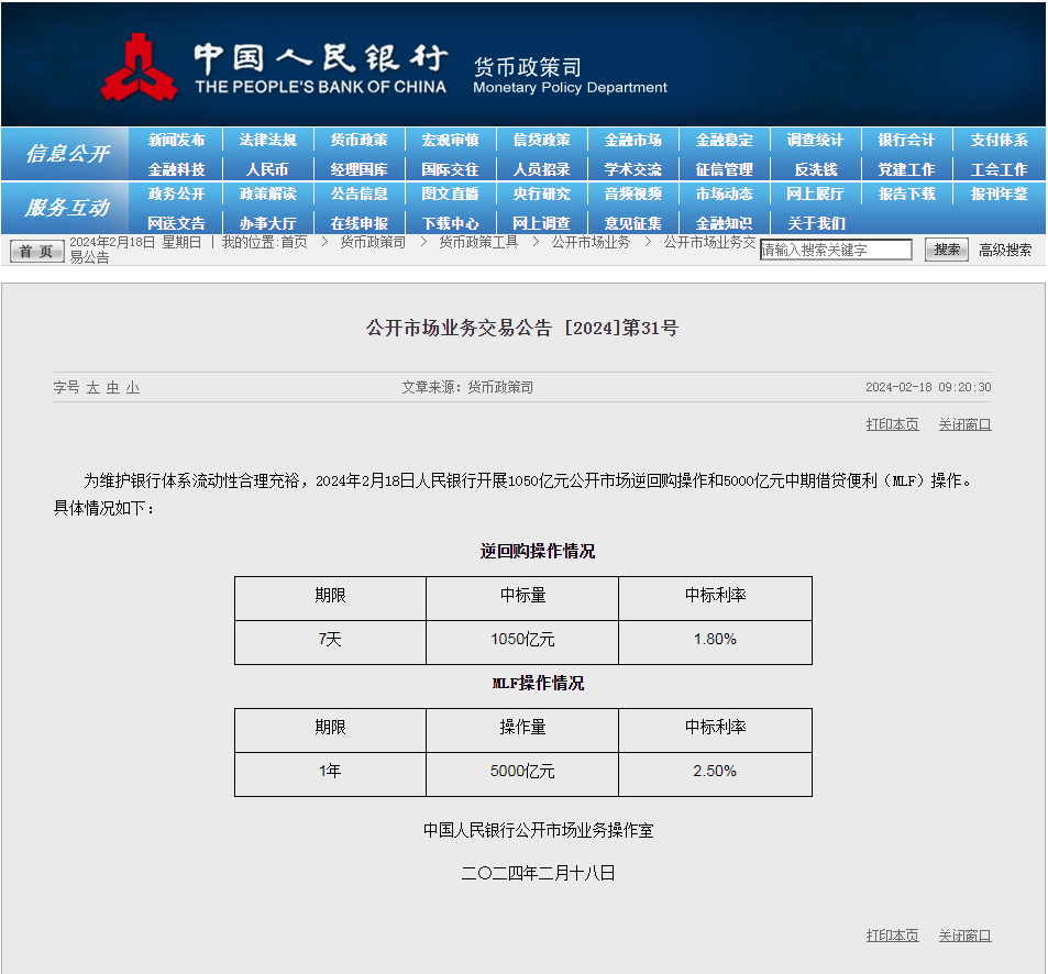 (大公文匯全媒體記者 倪巍晨、楊楚依)為維護銀行體系流動性合理充裕,2024年2月18日中國人民銀行開展1050億元(人民幣,下同)公開市場逆回購操作和5000億元中期借貸便利(MLF)操作,中標利率分別為1.8%和2.5%,均與此前持平,符合市場預期。