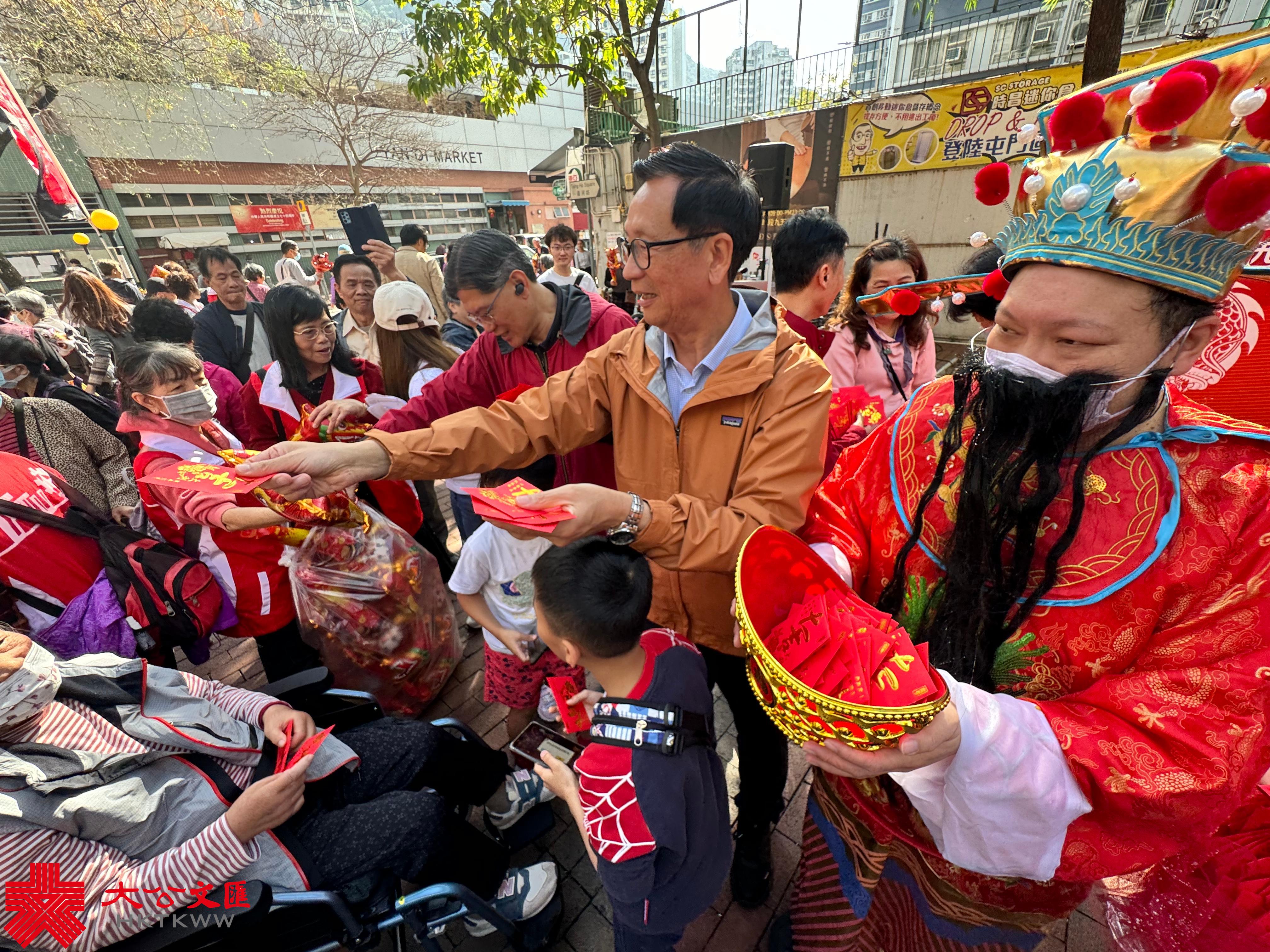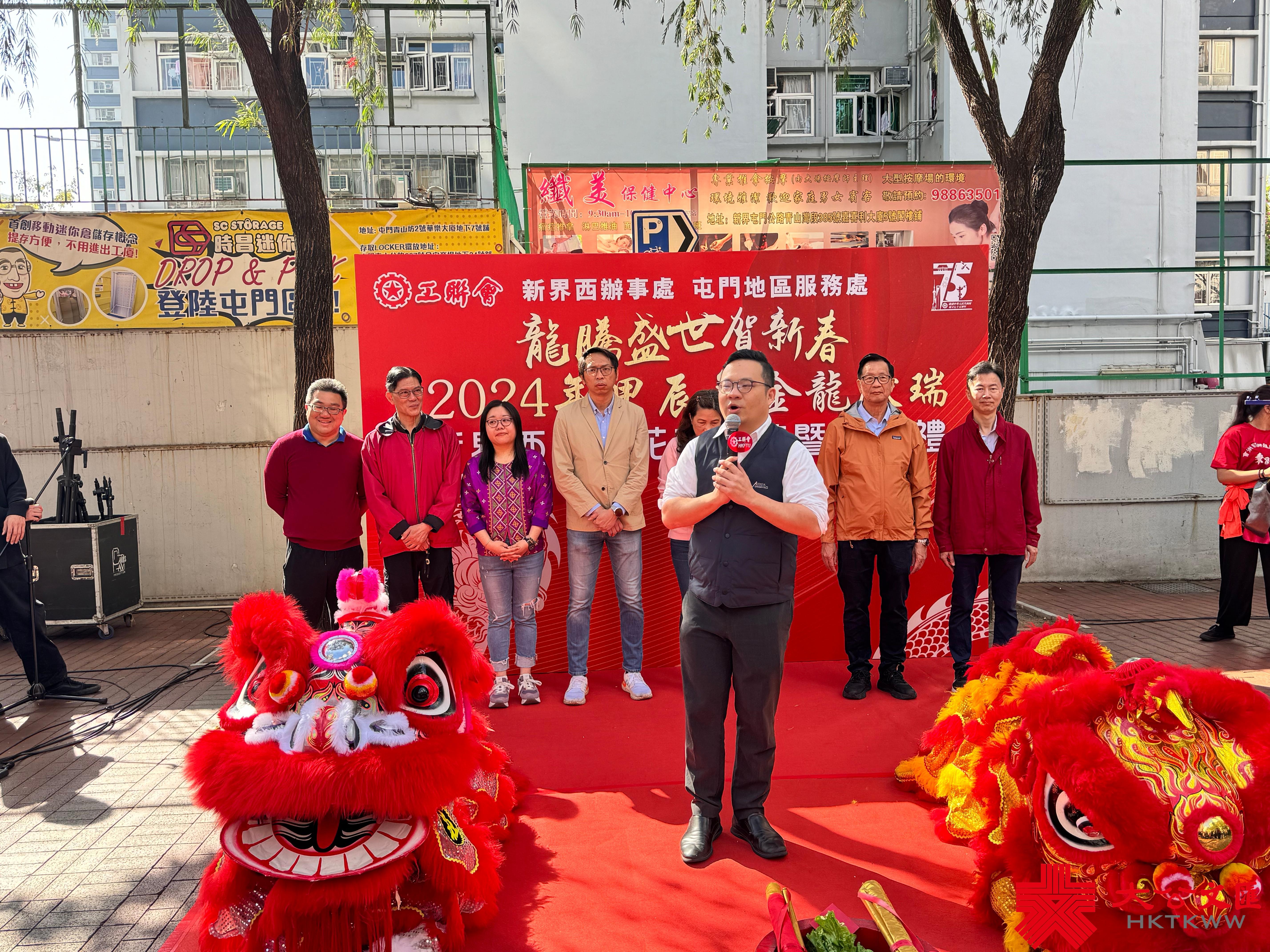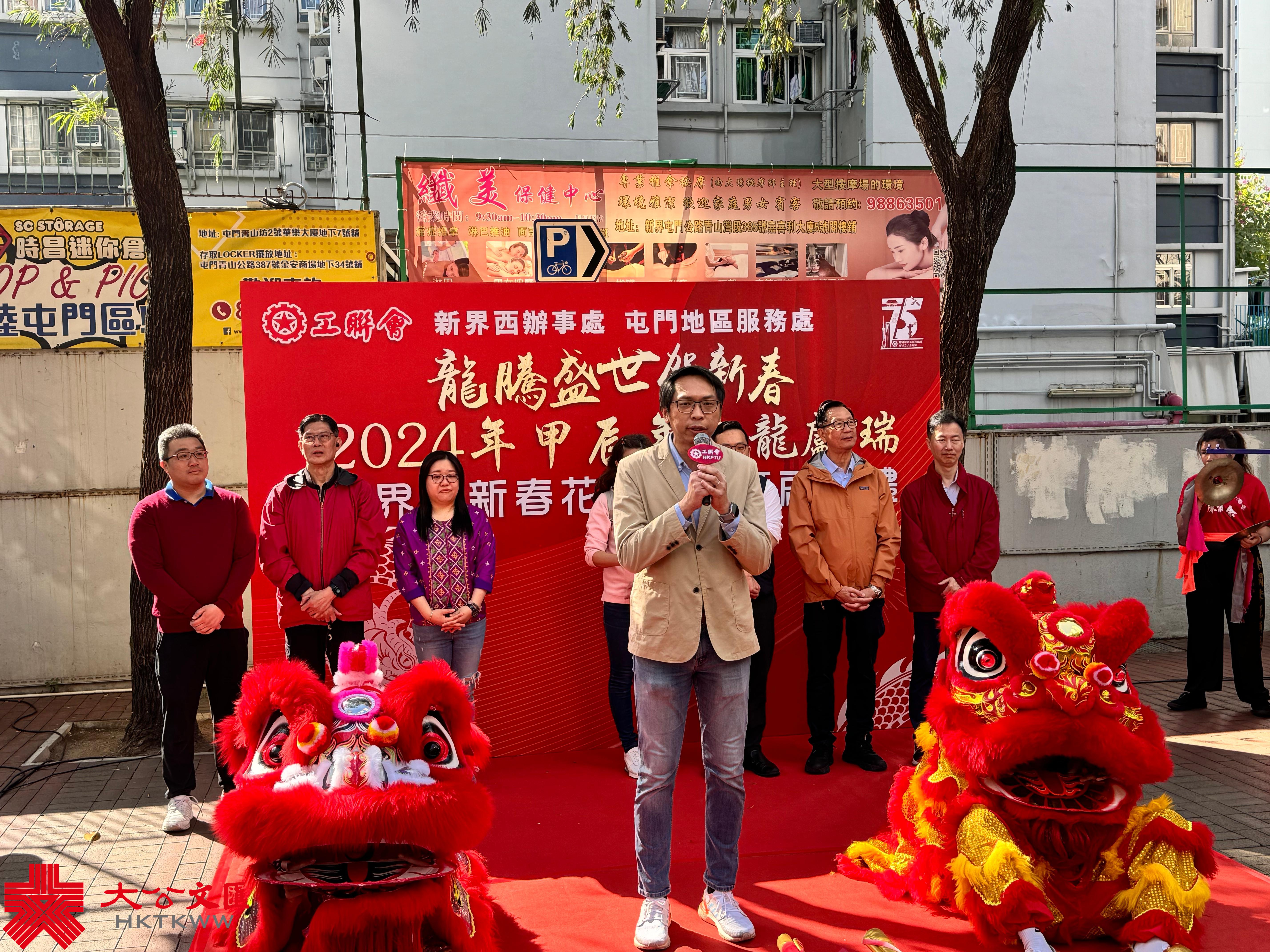 啟動禮今早於屯門舉行。工聯會政務委員會副主任、新界西辦事處主任歐志輝致辭時表示,希望通過巡遊與街坊分享新春喜悅,而花車巡遊期間也會聆聽各位街坊對社區和政府施政的意見,歡迎街坊轉達新春期望,再轉交特區政府。他續指,完善選舉制度、落實「愛國者治港」後,工聯會在屯門有多位區議員為大家服務,將堅持「為民生、撐基層」,在議會為大家發聲。