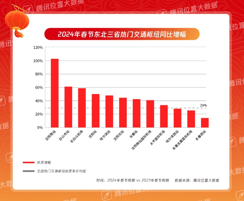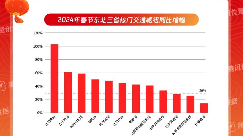 從2023年年底至今,東北三省冰雪游、山河四省歷史文化游掀起了新一輪的文旅熱潮。騰訊位置大數據顯示,在東北熱門景區中,長春冰雪新天地、瀋陽故宮、偽滿皇宮博物院、凈月潭、哈爾濱冰雪大世界等熱度同比增幅超過100%,遠超全國數百個熱門景區32%的同比增幅。