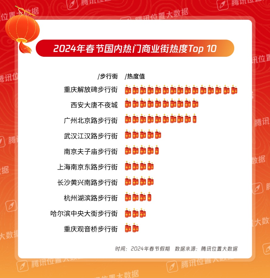 除了打卡景區、博物館,休閒逛街也是人們在春節假期的重要選擇。騰訊位置大數據對全國數十個商圈和商業街的熱度進行觀測,春節期間,重慶解放碑步行街成為最火商圈,西安大唐不夜城、廣州北京路步行街緊隨其後。熱度同比增幅最多的是南昌勝利路步行街,增幅超過了400%,北京前門大街、鄭州德化步行街、北京王府井大街等也都進入復甦榜前十,熱度增長均超過100%。