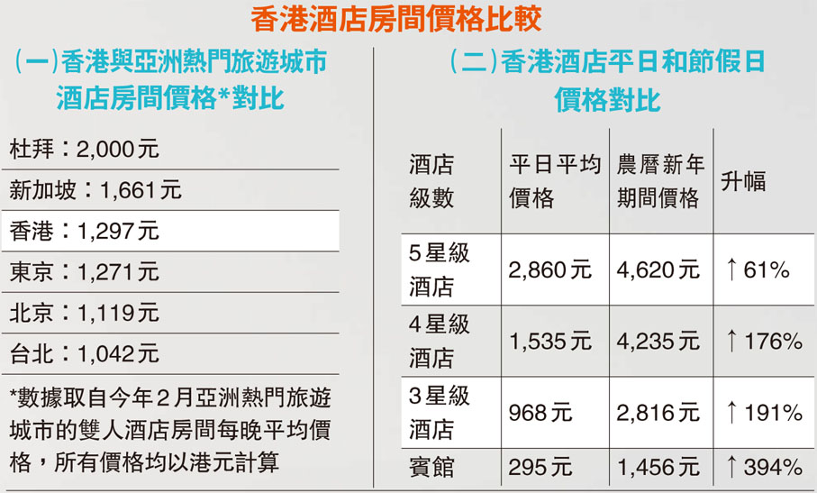 他指出,香港酒店價格一般日子與日本等亞洲熱門旅遊城市相若,但部分酒店節日期間房價急升,超出很多旅客的承受範圍,旅客或寧到深圳住酒店,或選擇即日來回。他表示,明白難在節假期間要求酒店減價,建議可推出「酒店+盛事」節日套票,強化盛事經濟效應,即政府牽頭統籌業界將酒店住宿和多項旅遊體驗綑綁出售,並提供具吸引力的價格折扣,鼓勵旅客趁盛事和節日檔期在港過夜消費,「商界少賺點,多人來港時旅客及商界均得益。」他並建議參考澳門向中途市場旅客派發非即日車船票,鼓勵延長留港消費。