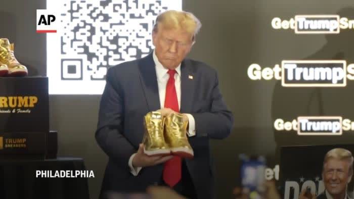 據報道,特朗普當天在費城會議中心舉行的球鞋展會上,手持一雙金色的「特朗普」牌球鞋進行展示。