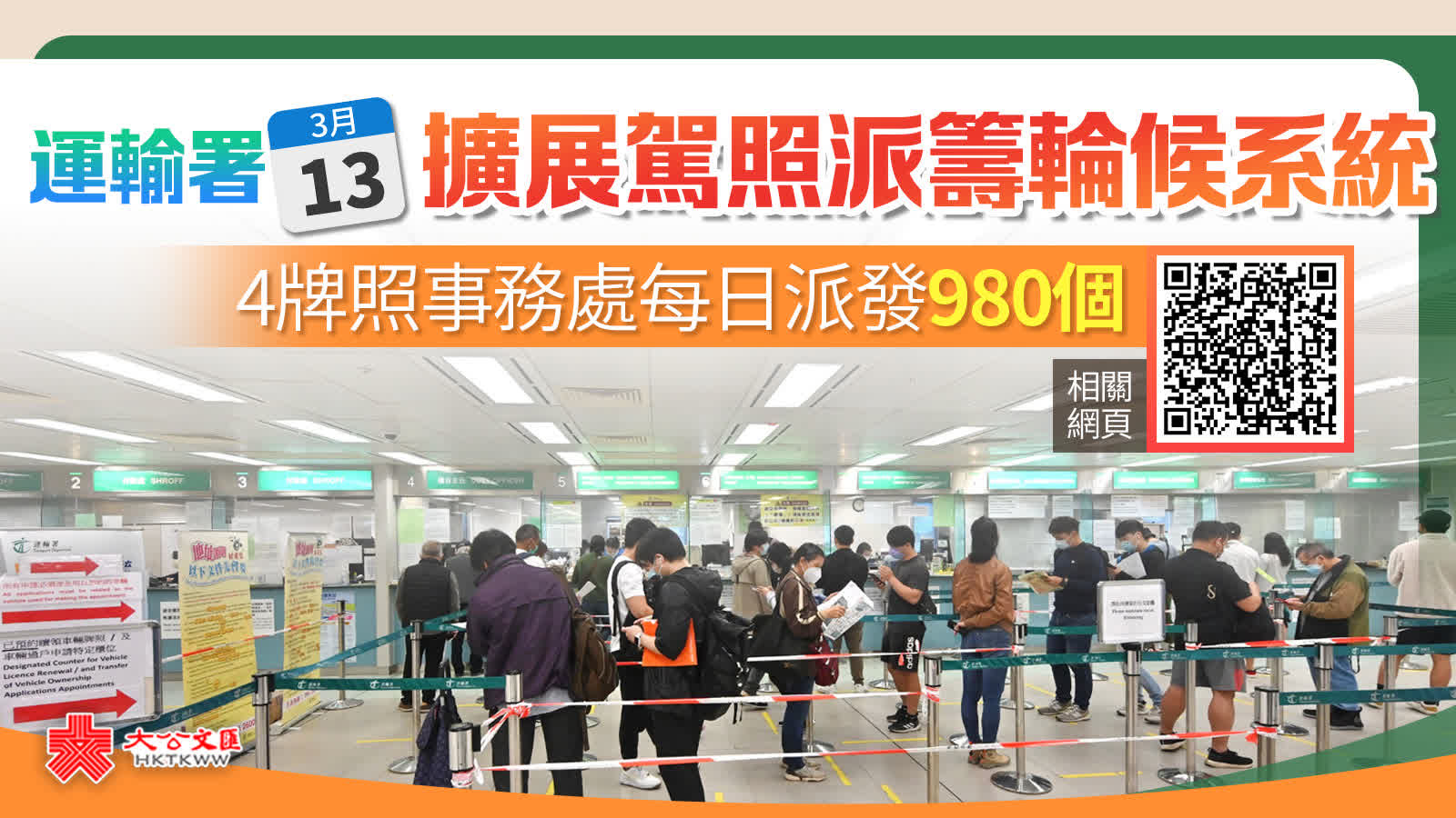大公文匯全媒體報道,運輸署今日(19日)表示,3月13日起,於九龍牌照事務處試行的駕駛執照相關櫃位服務派籌輪候系統,將擴展至金鐘、沙田及觀塘的牌照事務處。