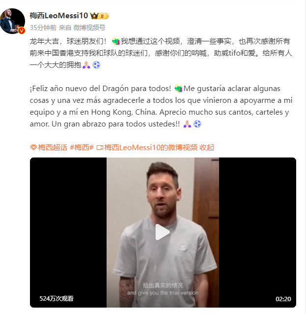 美斯在視頻中說:「我聽到有人說我因為政治原因或許多其他原因不想參賽,但這些都不是真的。從職業生涯伊始,我就與中國有着非常緊密和特別的緣分,在這裏的採訪、比賽和活動,讓我留下美好回憶。」美斯強調,他在訪港前已患內收肌炎症,「我已盡自己所能,也參加了訓練與孩子們的足球互動課,但我真的無法上場參賽。我感到不適,有加劇傷情的風險。幾天後,傷處感覺稍好點,這也是為什麼我在日本上場了一會兒。」美斯說。