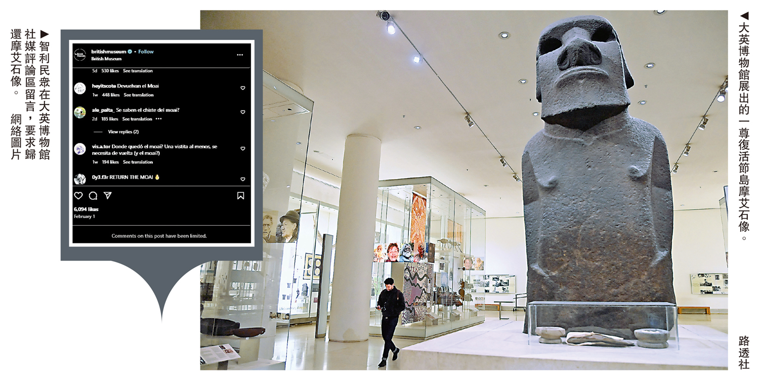自1月以來,大量來自智利的社交媒體用戶佔領了大英博物館的Instagram評論區以及YouTube和Facebook頁面,要求館方歸還藏有的2座摩艾石像。大英博物館一度被迫關閉了數十條Instagram帖子的評論。目前大部分帖子的評論已重新開放,但一些帖子的評論仍然受限。