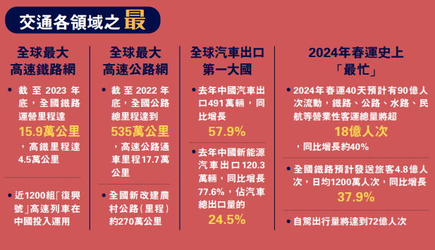 (大公報記者 方俊明)「貴廣鐵路提速後首次參加春運,使今年高鐵返鄉僅需4小時左右,加上轉車回到農村,一共才5個多小時。」貴州務工人員老周說起今年回家過年的過程,十分雀躍地表示,今年坐火車返鄉無論是購票還是路程都較以往更便捷。「還有部分老鄉今年買了國產小汽車,自駕返鄉也只用了9個多小時,而之前騎摩托冒着風雪的返鄉路至少需要『四天三夜』」。年輕人、商務群體則可能更青睞坐飛機。如今,新春回鄉探親、出行外遊方式更加多元,飛機、高鐵、自駕……總有一款適合你。老周及老鄉們回家路的變遷,背後折射的不僅是中國交通的跨越式發展,還有新質生產力的崛起和國人對國貨國潮的自信。