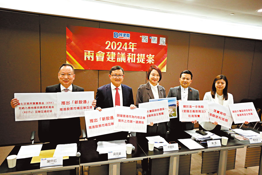 李慧琼聯同4名港區全國人大代表陳仲尼、黃英豪、陳勇、黃冰芬,昨日在記者會上介紹民建聯擬於今年兩會提出的其中六項建議,包括《關於推出「新股通」推進股票市場互聯互通的建議》《關於優化交易所買賣基金(ETF)、及納入房地產投資信託基金(REITs)互聯互通安排的建議》《關於明確香港作為內地企業境外上市第一選擇地的建議》《關於建設大灣區綠色環保、循環再造生態圈的建議》《關於進一步推動愛國主義教育法在港落實的建議》及《關於兩地通關便利的建議》。