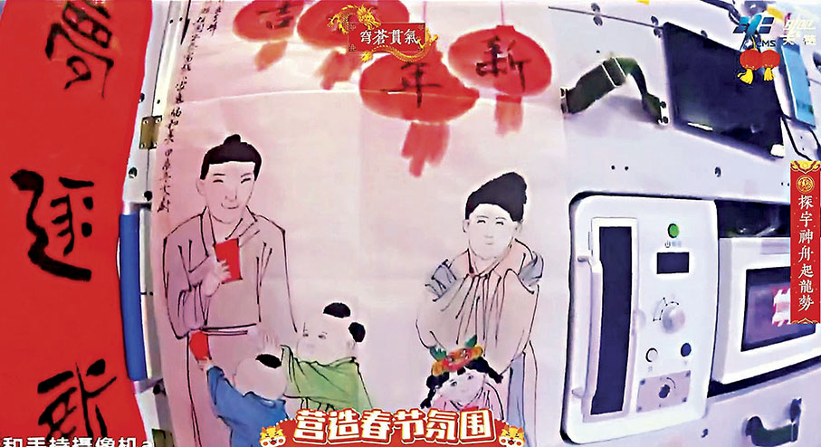 空間站的春節與地面上一樣熱鬧喜慶,太空人們會自己揮毫寫春聯,也會將地面上運送來的年味裝飾品布置在艙內。不過,空間站出現精美的年畫,還是第一次。在天宮空間站問天艙,太空人們布置好《龍年大吉》年畫,並手持相機專門拍攝了大特寫,顯示出對這幅畫作格外的喜愛。