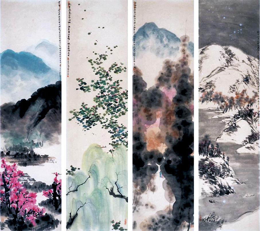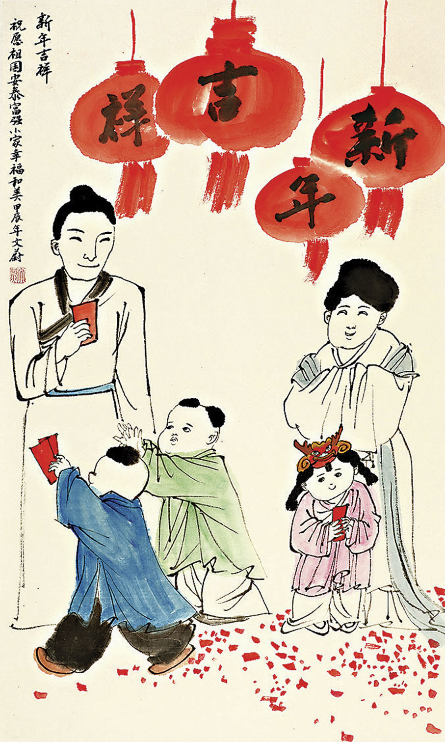 紅燈高懸,煙花滿地,身穿傳統服飾的夫妻二人眼角帶笑,與兩兒一女嬉戲拜年,《龍年大吉》畫出好一幅家庭美滿、生活幸福的中國過年圖景。其實,這幅畫作的題材在文蔚的作品中並不常見。作為當代中國畫壇的實力派藝術家,文蔚以大氣宏偉的山水、精緻秀麗的仕女知名於世。之所以為空間站選擇這樣的題材,背後是文蔚的一番巧思。