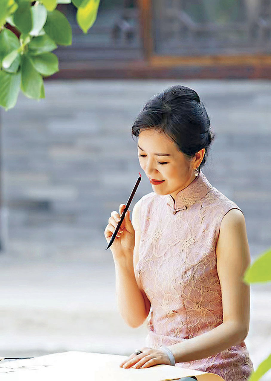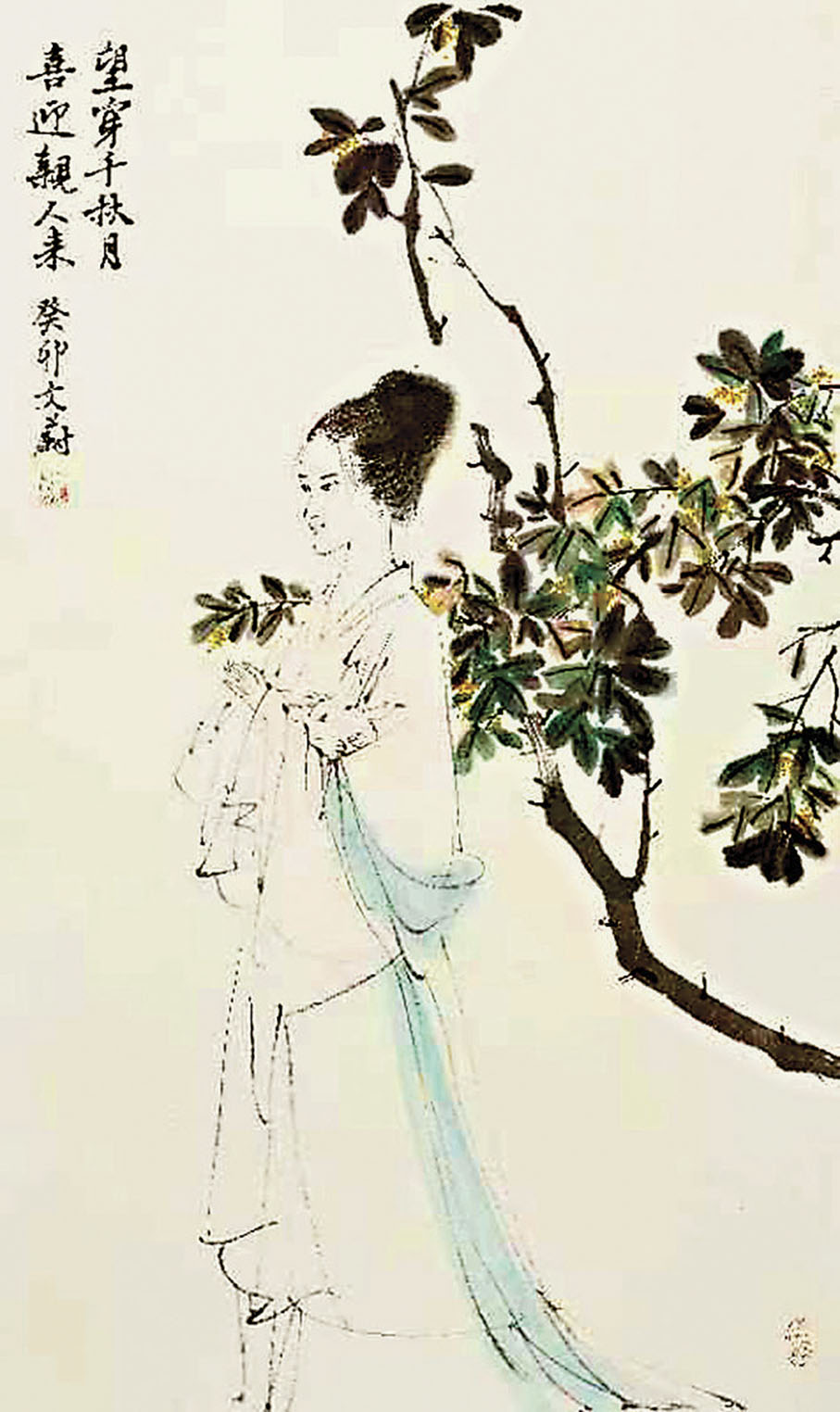 2023年秋,文蔚接到為空間站作畫的「神秘」任務。「畫作能夠進入空間站,是十分難得的機會。作為中國傳統藝術的傳道者,我感受到的是當中國書畫藝術進入太空,中國人天人合一的古老夢想、以和為美的文化追求在當代中國綻放出了新的榮光。」回想起那段創作的日子,文蔚不無感慨。她推掉所有的其他工作,在畫室中潛心閉關,從構思到動筆足足畫了一個多月,幾易其稿。創作伊始,文蔚選擇從自己擅長的仕女圖入手。談到飛天,中國人都會想到嫦娥。於是,文蔚創作了一幅嫦娥懷抱玉兔的作品《喜迎親人來》。畫中的嫦娥飄逸秀美,柔和堅定的眼神望向遠方,寓意月宮中的嫦娥正盼望着太空人們的到來。畫作完成後,立意和技法都非常完美,但文蔚卻總覺得似有幾分清冷,不甚滿意。