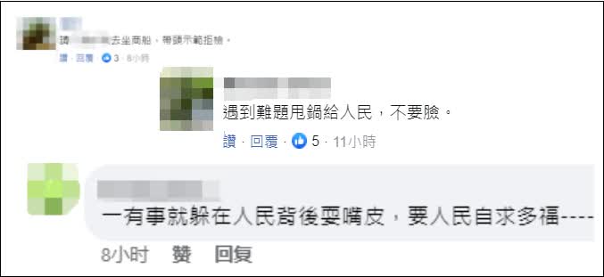 也有台灣網友表示,「請台交通事務主管部門負責人去坐商船,帶頭示範拒檢。」還有網友痛批台當局:「遇到難題甩鍋給人民,不要臉」「一有事就躲在人民背後耍嘴皮,要人民自求多福」。
