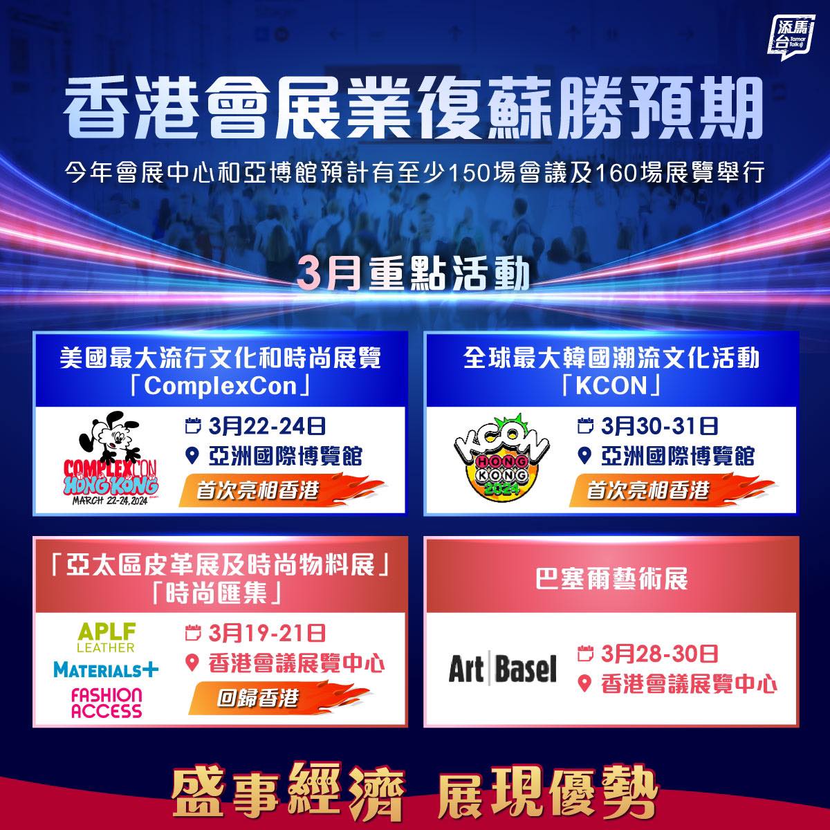 大公文匯全媒體報道,特區政府表示,香港會展業在2024年有望整體回復甚至超越疫情前水平,預計會展中心和亞博館將合共舉辦至少150場會議及160場展覽。