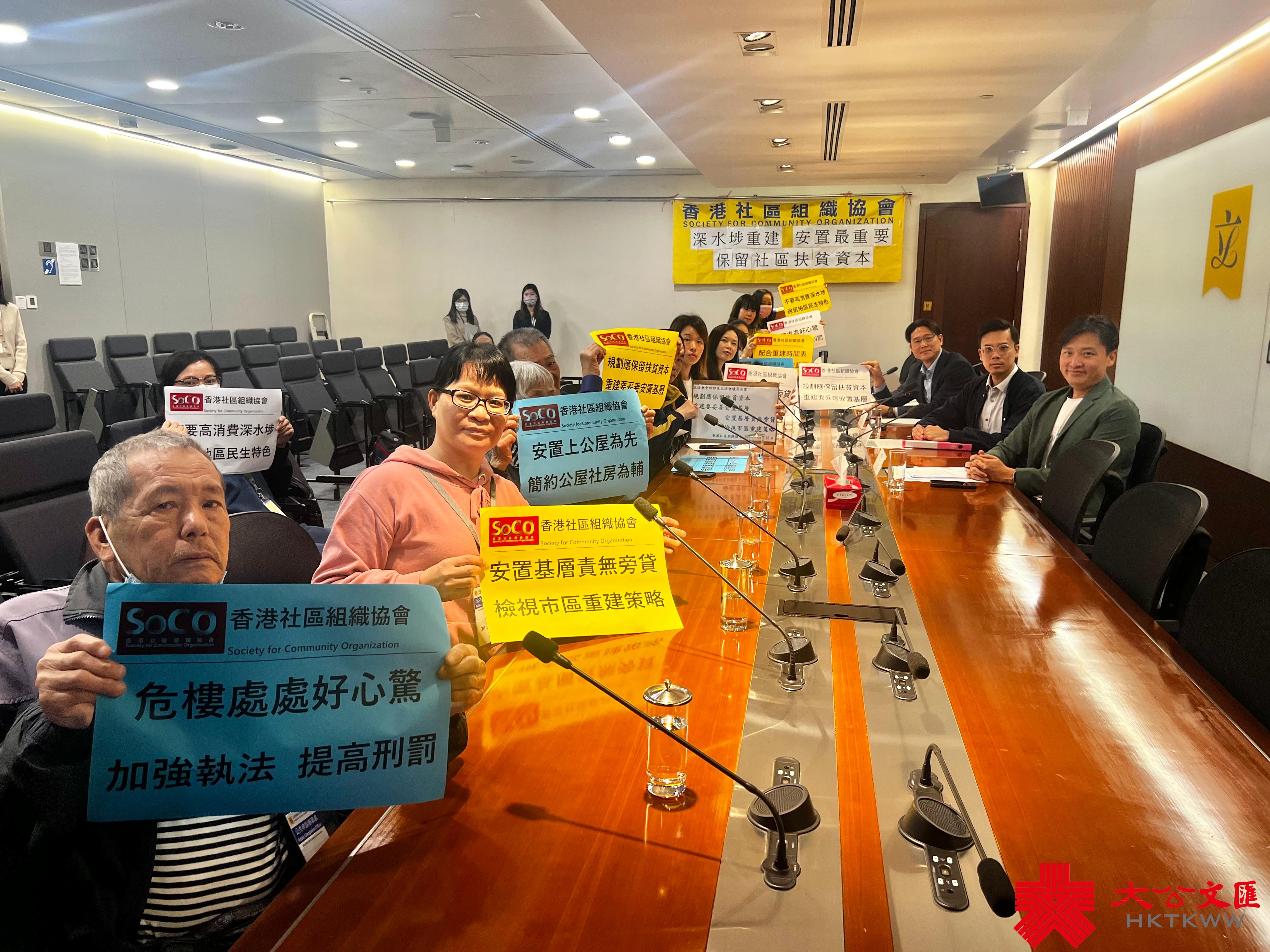 (大公文匯全媒體記者 周傾芫)市建局預告將在下半年更新深水埗重建藍圖,牽涉到區內近45000名劏房住客的去留。香港社區組織協會於2023年9月進行《基層租客對深水埗地區規劃研究意見調查》,訪問了303名租住深水埗床位、板間房、劏房等劣質居所的住客,發現基層民眾無法掌握重建資訊,難以有效表達對安置賠償的意見。立法會議員鄭泳舜、梁文廣、梁子穎與深水埗居民代表見面,探討如下問題。