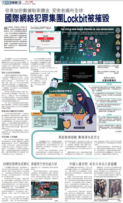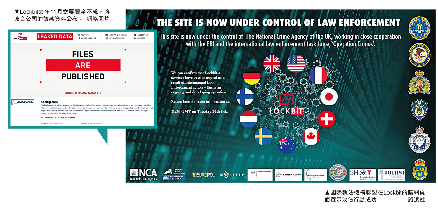 大公報綜合路透社、彭博社及《衛報》報道:成員包括英國國家打擊犯罪調查局(NCA)和美國聯邦調查局(FBI)在內的國際執法機構聯盟20日宣布,已成功摧毀了全球最臭名昭著的黑客組織Lockbit,並關閉了該組織用於勒索軟件付款的網站。Lockbit通過惡意軟件加密受害人的數據來勒索贖金,在全球有逾2000受害公司或機構,包括波音公司、英國皇家郵政等都曾遭其毒手。
