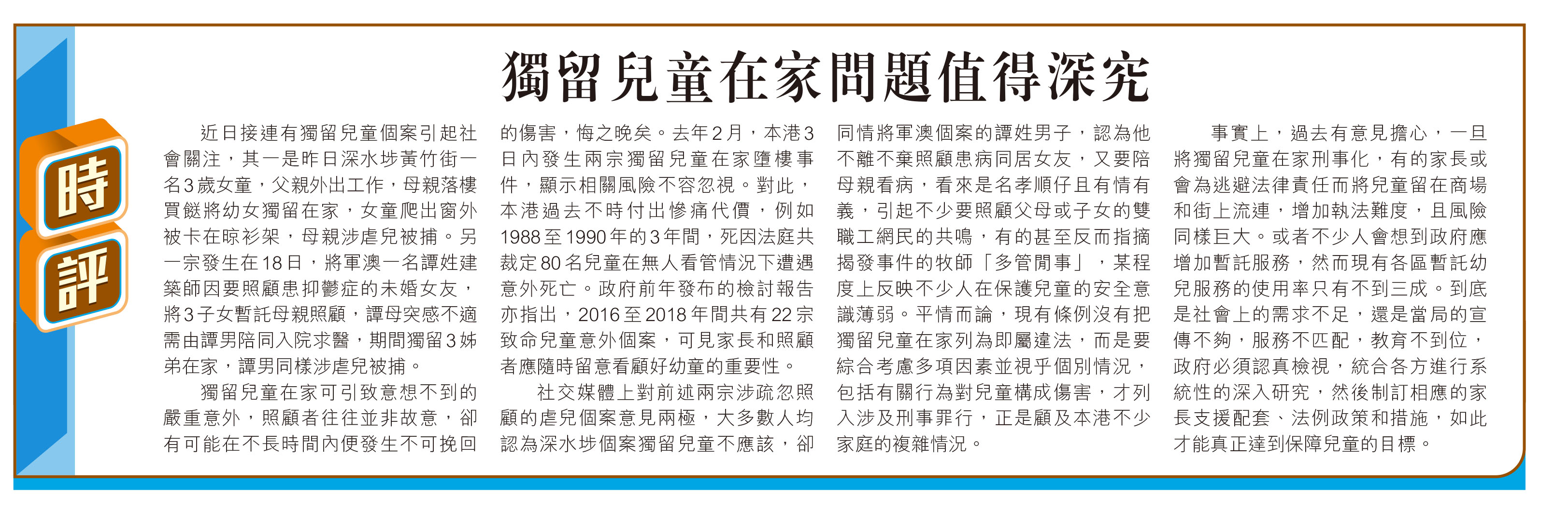 獨留兒童在家可引致意想不到的嚴重意外,照顧者往往並非故意,卻有可能在不長時間內便發生不可挽回的傷害,悔之晚矣。去年2月,本港3日內發生兩宗獨留兒童在家墮樓事件,顯示相關風險不容忽視。對此,本港過去不時付出慘痛代價,例如1988至1990年的3年間,死因法庭共裁定80名兒童在無人看管情況下遭遇意外死亡。政府前年發布的檢討報告亦指出,2016至2018年間共有22宗致命兒童意外個案,可見家長和照顧者應隨時留意看顧好幼童的重要性。