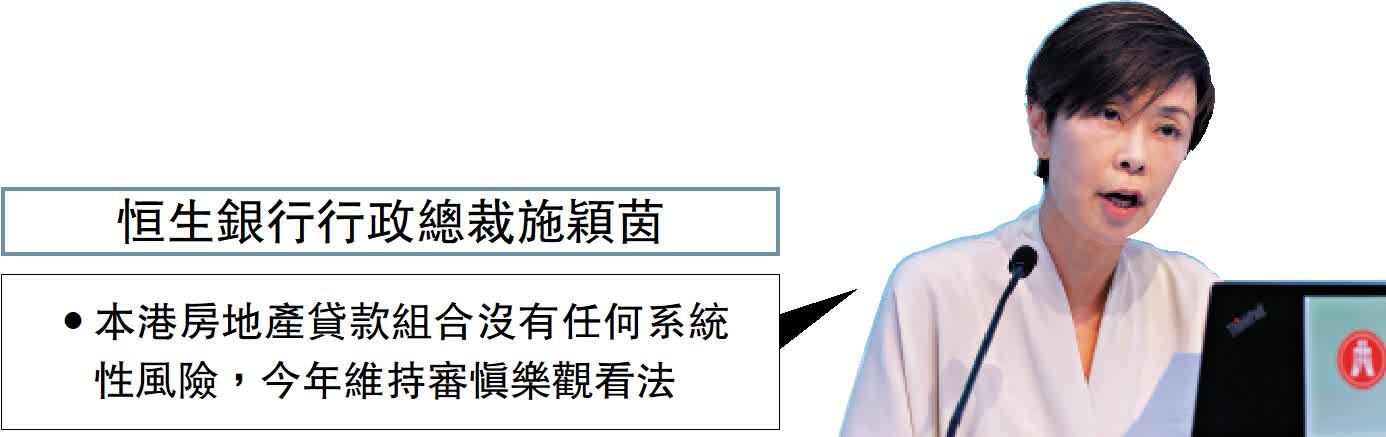 港股及樓市疲弱,恒生銀行行政總裁施穎茵昨日派定心丸,強調房地產貸款組合沒有任何系統性風險,並強調恒生的風險承擔能力無變,對今年業務前景維持審慎樂觀的看法。她又稱,內房信貸損失已於2022年見頂,料今年下降趨勢持續。