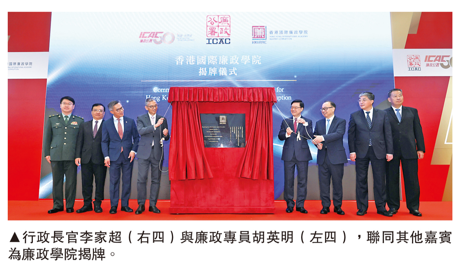 典禮上,李家超與胡英明,聯同中央政府駐港聯絡辦副主任羅永綱、外交部駐港特派員公署副特派員方建明、駐港國家安全公署聯絡局局長鄧建偉、解放軍駐港部隊副政治委員王兆兵少將、副廉政專員兼執行處首長丘樹春及貪污問題諮詢委員會主席廖長江等主持揭牌儀式。