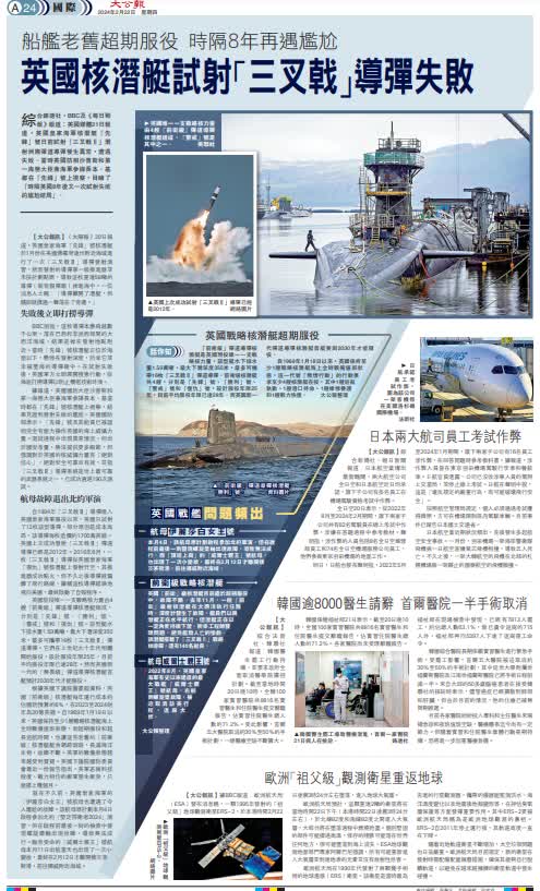 大公報綜合路透社、BBC及《每日郵報》報道:英國媒體21日報道,英國皇家海軍核潛艇「先鋒」號日前試射「三叉戟Ⅱ」潛射洲際彈道導彈發生異常,遭遇失敗。當時英國防相沙普斯和第一海務大臣兼海軍參謀長本·基都在「先鋒」號上視察,目睹了「時隔英國8年後又一次試射失敗的尷尬結局」。
