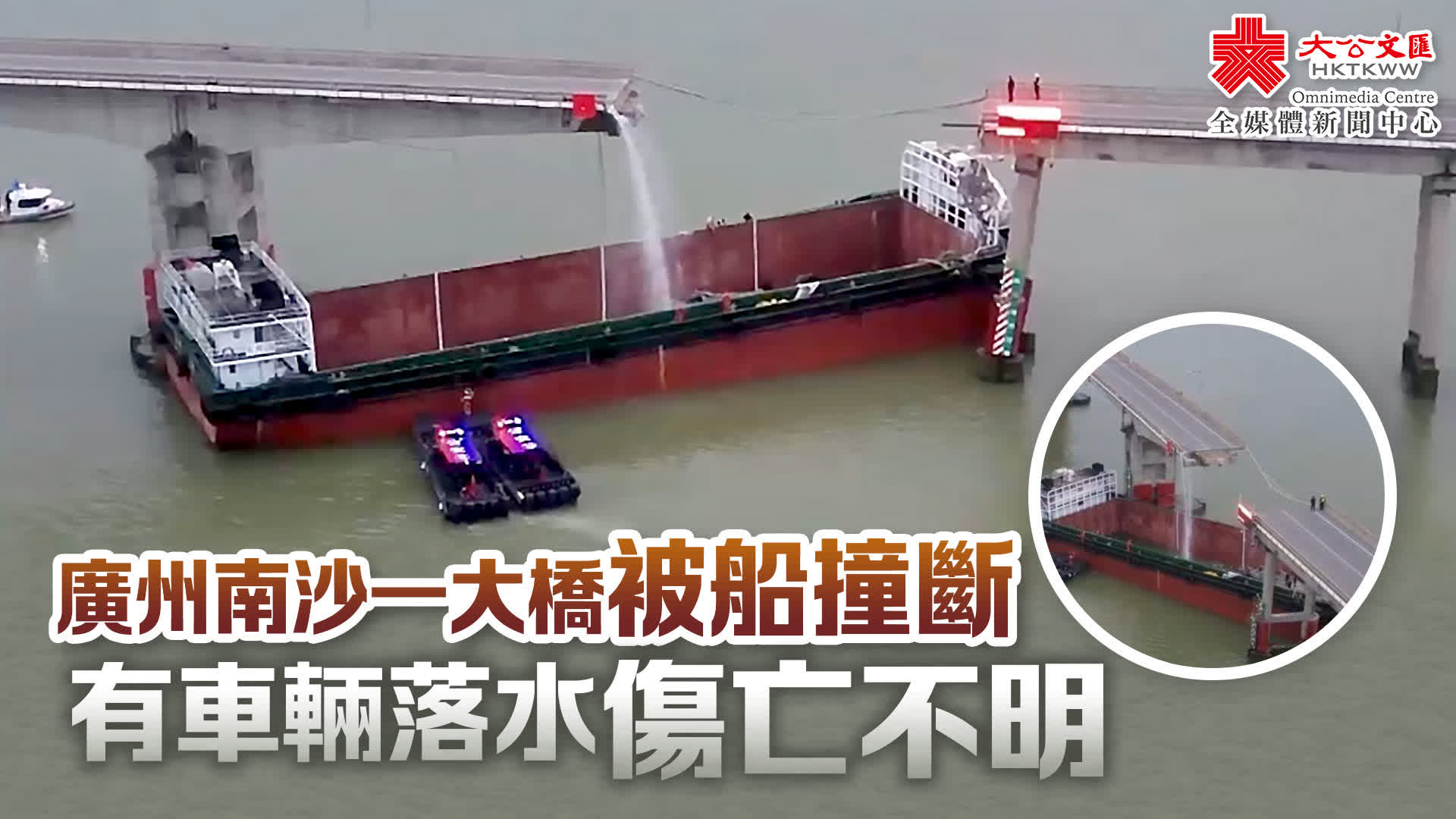 廣州南沙瀝心沙大橋被船隻撞斷,有車輛落水。(央視新聞)