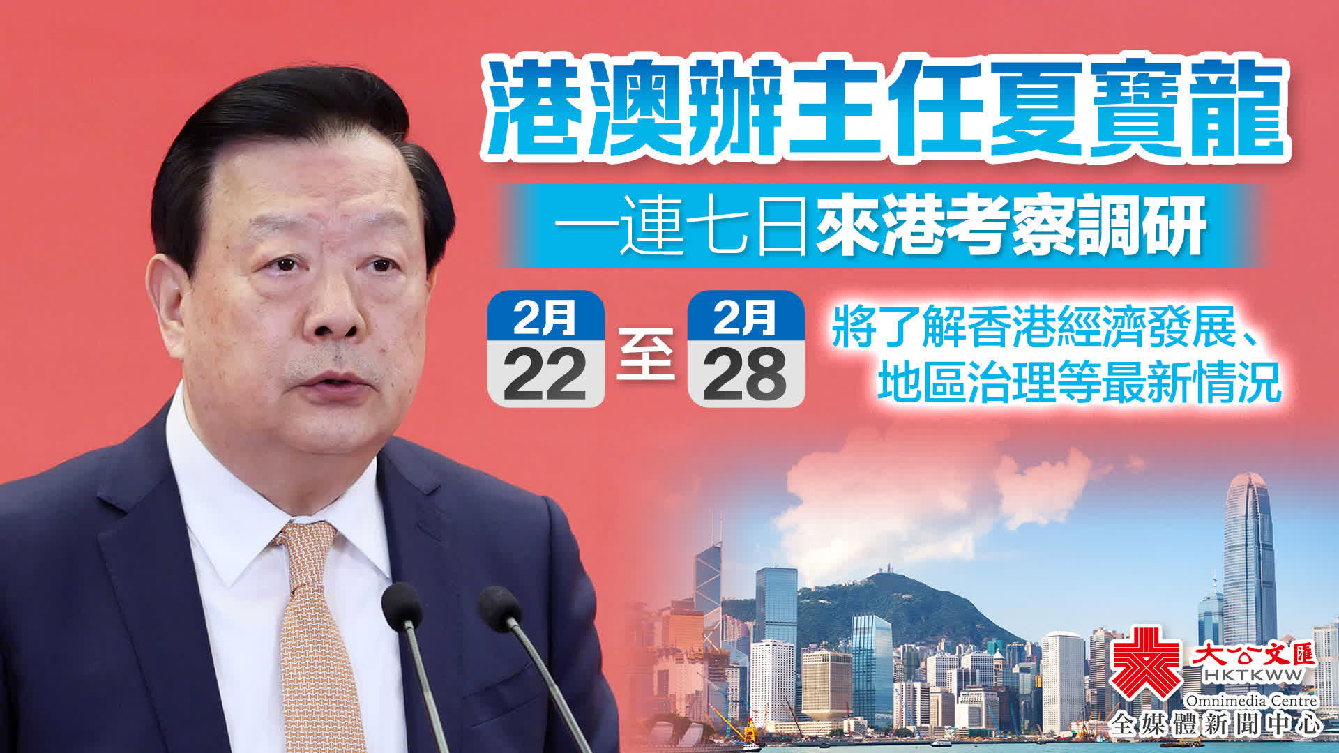 政府表示,夏寶龍即日起至下星期三(28日)來港考察調研,了解香港經濟發展、地區治理等方面的最新情況。