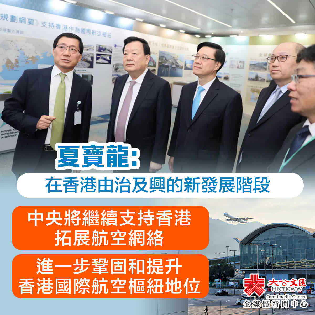 他表示,香港國際機場是享譽全球的金字招牌。長期以來,香港充分發揮背靠祖國、聯通世界的優勢,形成了國際航空樞紐地位。在香港由治及興的新發展階段,中央將繼續支持香港拓展航空網絡,進一步鞏固和提升香港國際航空樞紐地位。