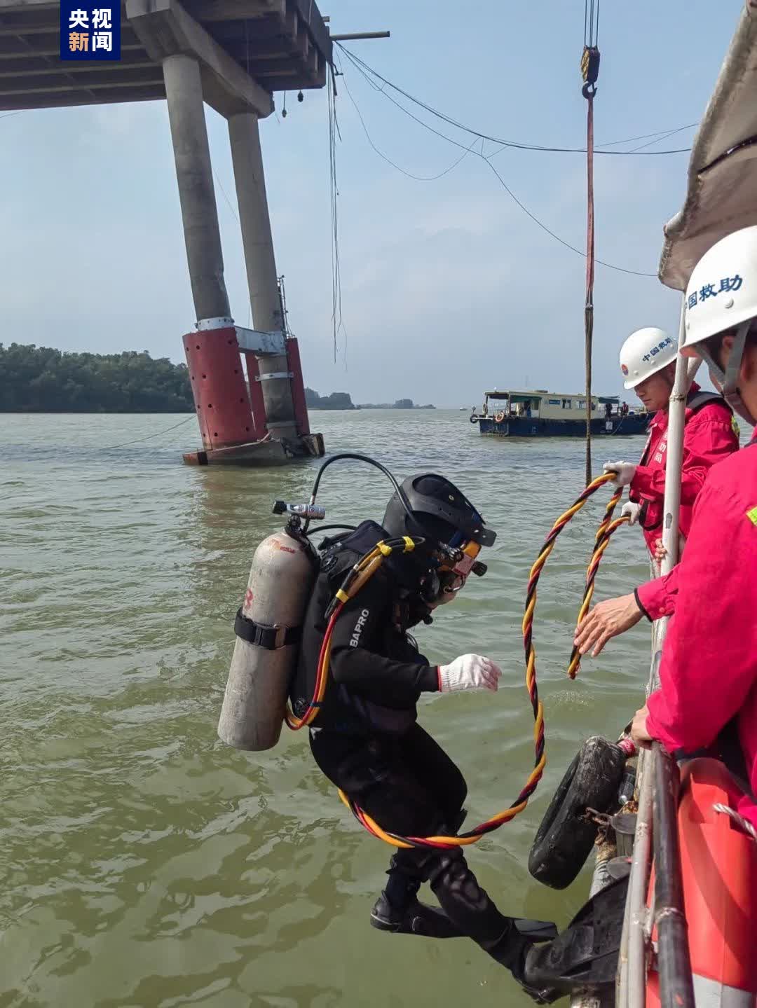 據南海救助局廣州救助基地現場救助指揮貝承璋介紹,救助現場因大橋橋墩出現明顯破損,墜落入水的水泥、鋼筋等雜物對水下搜尋作業增加一定風險,加之事發水域水流流速較大,車輛及人員落水後,水下搜尋面積大,給救助工作增加一定難度。