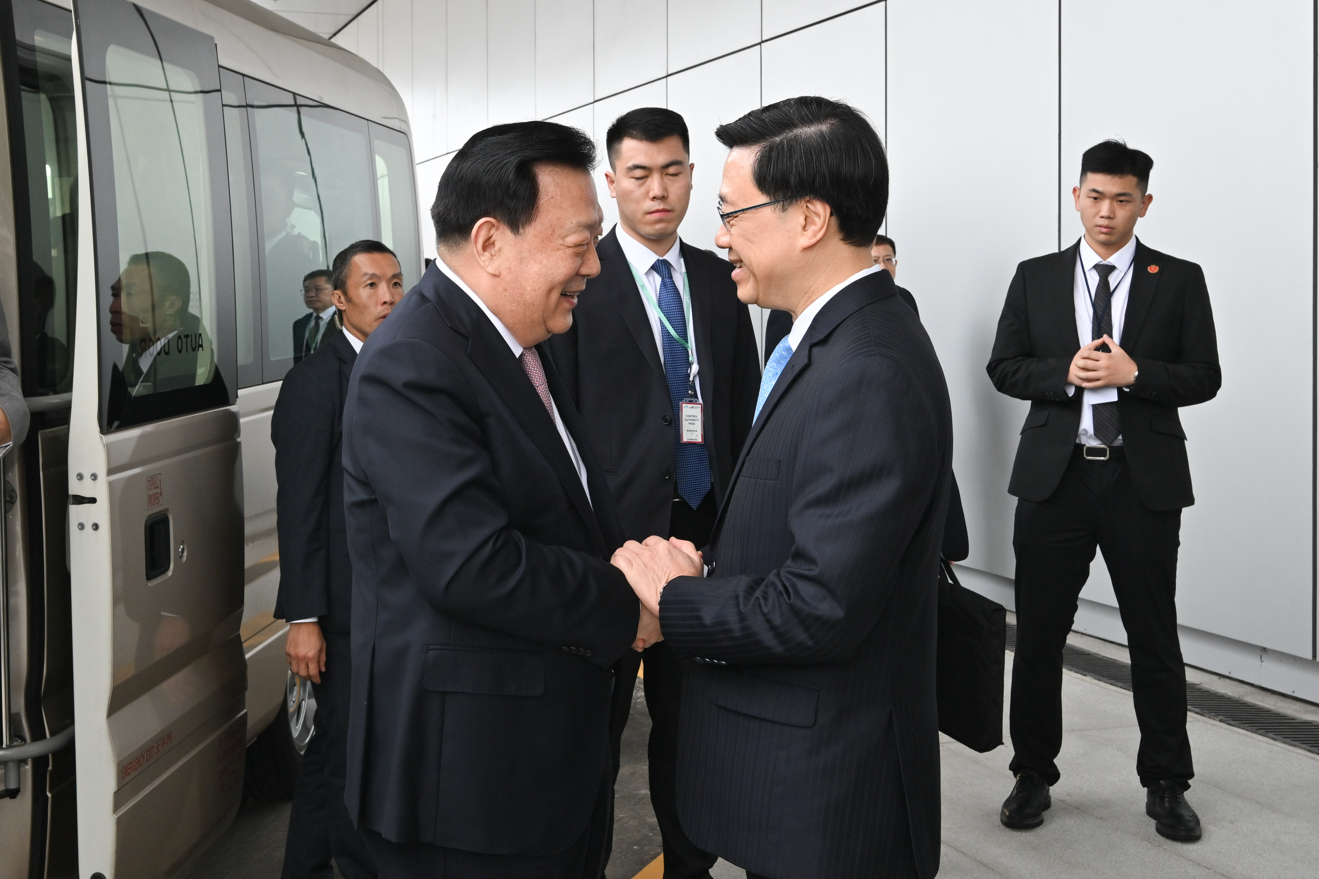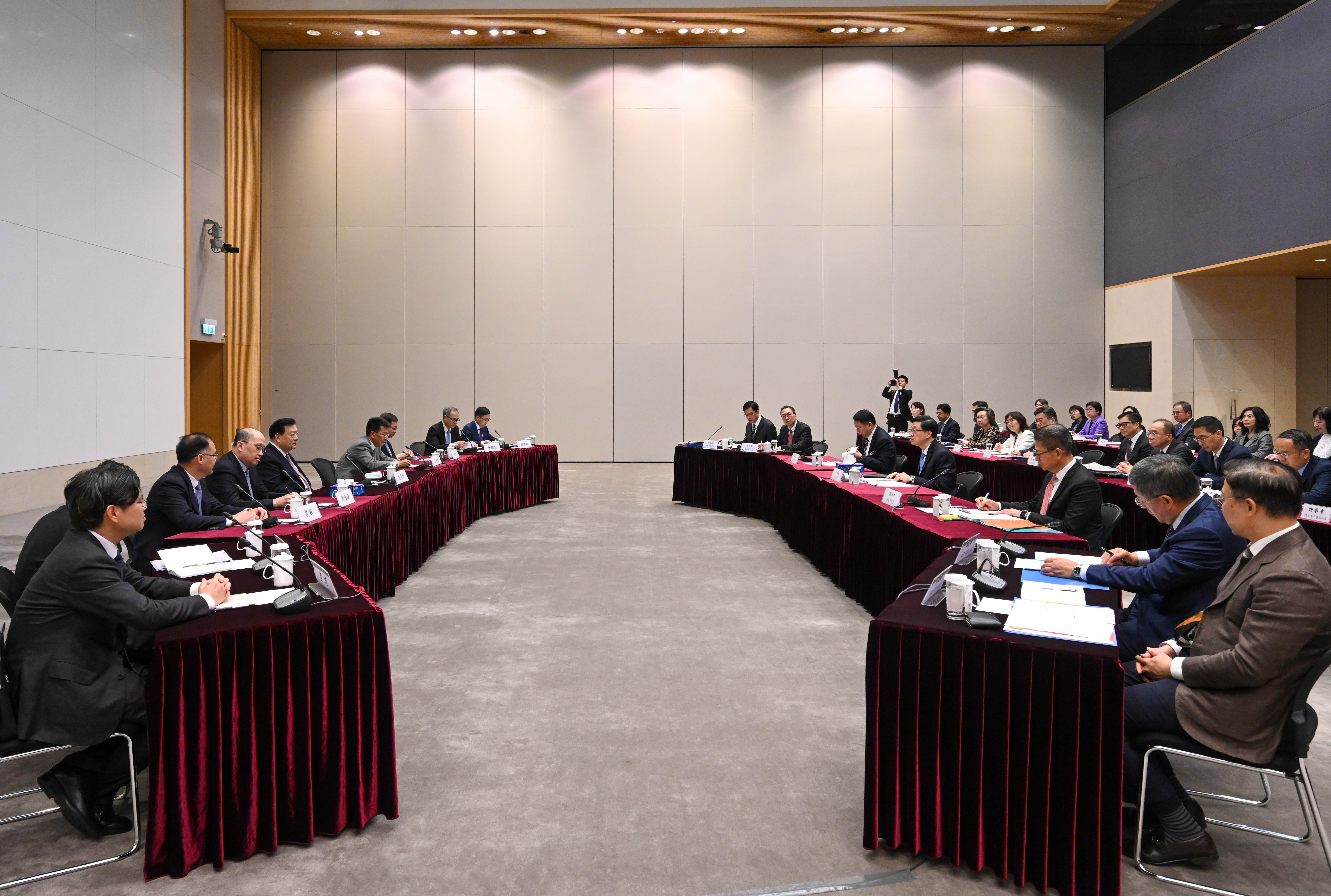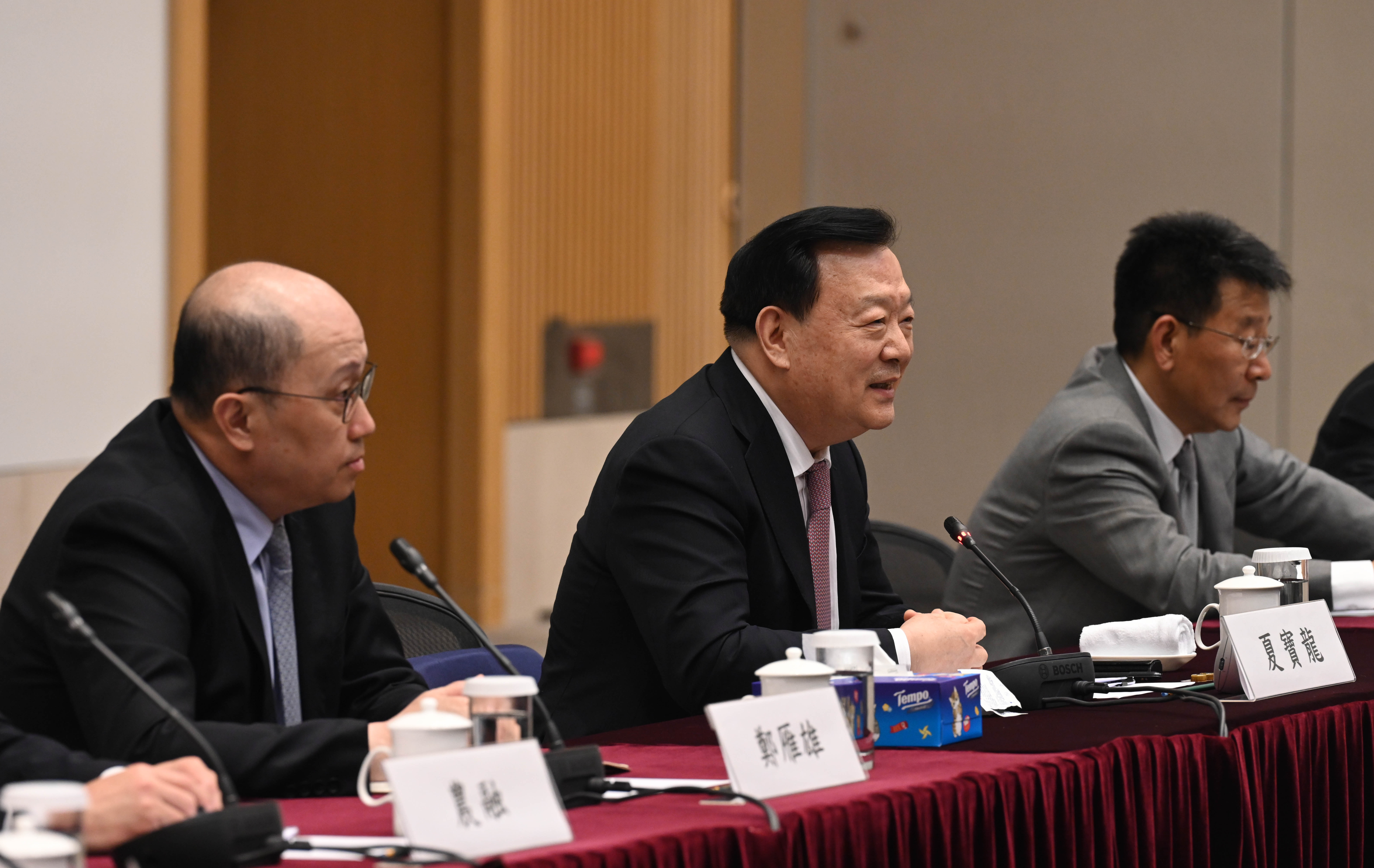 接着,夏寶龍主任與特區政府財經系統主要官員就香港的經濟發展作座談交流。李家超率領財政司司長陳茂波、財政司副司長黃偉綸、財經事務及庫務局局長許正宇、商務及經濟發展局局長丘應樺、林世雄、發展局局長甯漢豪、房屋局局長何永賢和創新科技及工業局局長孫東教授出席。