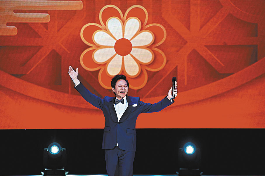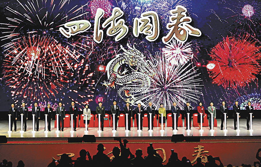 「四海同春」2024香港各界新春晚會昨晚首場演出在駐港部隊三軍儀仗隊演奏的國歌聲中揭開序幕。主禮嘉賓包括中央政府駐港聯絡辦副主任尹宗華,中央駐港國安公署副署長孫青野,解放軍駐港部隊副政委王兆兵,前特區行政長官林鄭月娥,行政會議非官守議員召集人葉劉淑儀,特區政府政務司副司長卓永興、文化體育及旅遊局局長楊潤雄、政制及內地事務局副局長胡健民,和四海同春藝術團團長、中國僑聯聯誼聯絡部副部長朱柳,一同為晚會主持亮燈儀式。