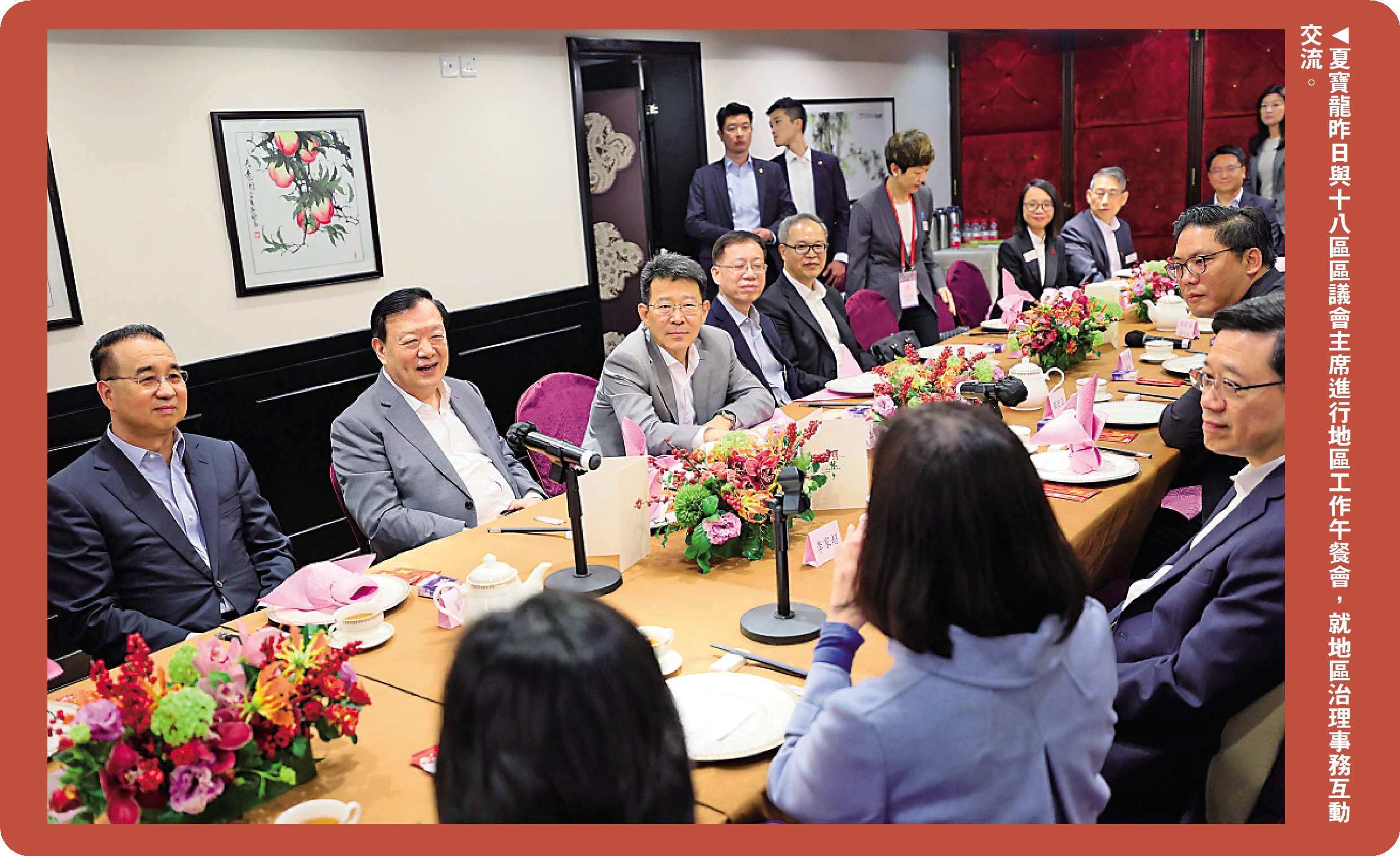 夏寶龍表示,做好地區治理是香港實現良政善治的必然要求。他勉勵大家用行動詮釋愛國愛港,展示地區治理新氣象,發揮好特區政府和市民之間的橋樑紐帶作用,切實做到「上情下達、下情上報」,牢牢守護「一國兩制」、守護香港繁榮穩定發展。