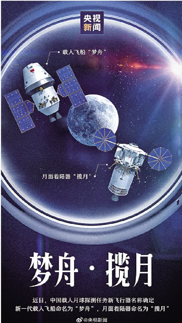 中國空間站建造完成後,登陸月球成為中國人探索太空的下一個目標。2023年8月,載人月球探測任務新飛行器名稱徵集活動開展,共收到來自航天、科技、文化傳播等領域的組織機構與社會各界人士的近2000份投稿。經專家遴選評審,將新一代載人飛船命名為「夢舟」,將月面着陸器命名為「攬月」。