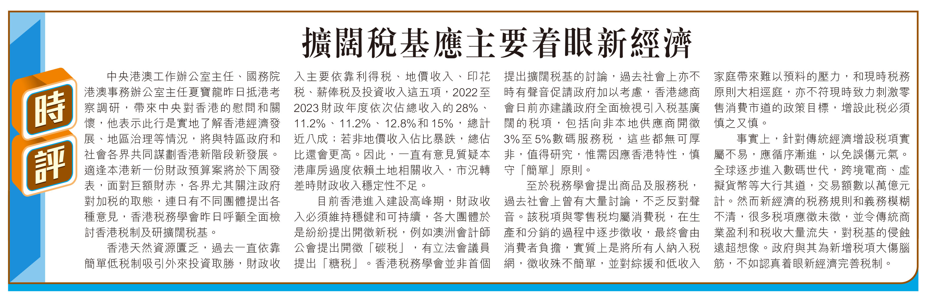 中央港澳工作辦公室主任、國務院港澳事務辦公室主任夏寶龍昨日抵港考察調研,帶來中央對香港的慰問和關懷,他表示此行是實地了解香港經濟發展、地區治理等情況,將與特區政府和社會各界共同謀劃香港新階段新發展。適逢本港新一份財政預算案將於下周發表,面對巨額財赤,各界尤其關注政府對加稅的取態,連日有不同團體提出各種意見,香港稅務學會昨日呼籲全面檢討香港稅制及研擴闊稅基。