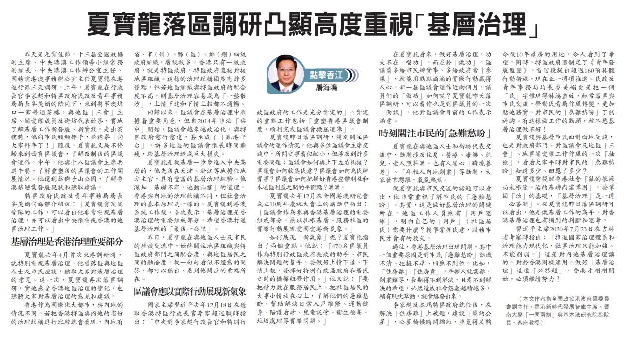 夏寶龍是從基層一步步進入中央高層的,他先後在天津、浙江等地擔任地方主官,具有豐富的基層治理經驗。他深知「基礎不牢,地動山搖」的道理。香港與內地的治理結構不同,但社會治理的基本原理是一樣的。夏寶龍到港澳系統工作後,多次表示,基層治理是香港治理的重要組成部分,希望香港打通基層治理的「最後一公里」。