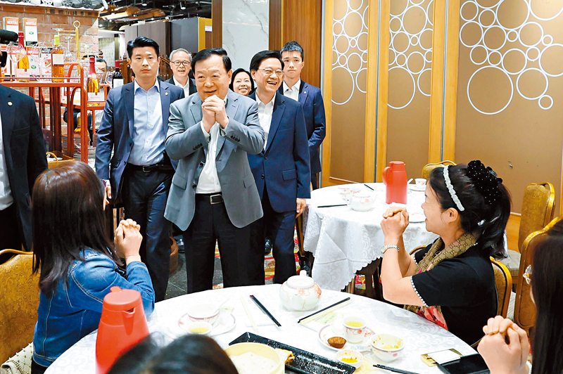 中央港澳工作辦公室主任、國務院港澳事務辦公室主任夏寶龍昨日早上先到將軍澳與地區人士飲早茶,有數名與夏寶龍同場飲早茶的市民指夏主任親切,向大家拜年說「恭喜發財」。有途經該酒樓的市民接受香港文匯報訪問時說,看到新一屆特區政府持續積極施政,發展經濟、改善民生,很想告訴夏主任及香港特區行政長官李家超,他們對香港未來充滿信心,期望中央能繼續支持香港更好融入國家發展大局,幫助港人安居樂業。
