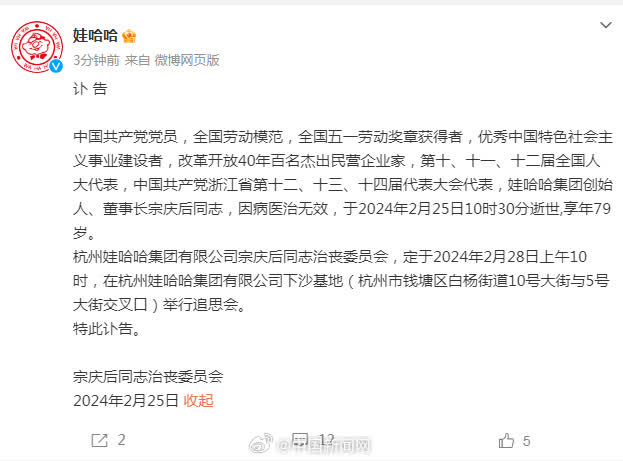 據中新網報道,娃哈哈集團創始人、董事長宗慶后因病醫治無效,於2024年2月25日10時30分逝世,享年79歲。