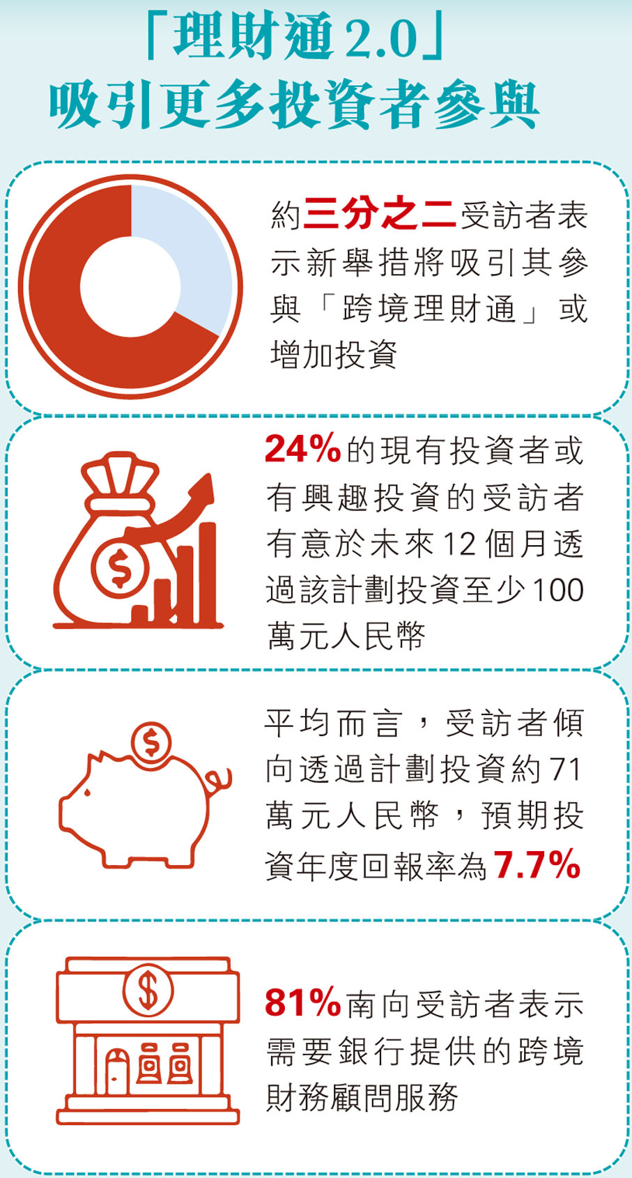 滙豐表示,為了解大灣區居民透過理財通計劃進行跨境投資的興趣及喜好,於今年1月至2月期間對大灣區11個城市逾2,000名居民進行了網上調查。調查發現約三分之二的受訪者認為新引入的優化措施,包括放寬投資者准入門檻、擴大產品選擇及提高個人投資額度,都是吸引其參與跨境理財通或對該計劃增加投資的推動因素。調查亦顯示,有81%南向受訪者表示需要銀行財務顧問提供跨境投資諮詢援助。