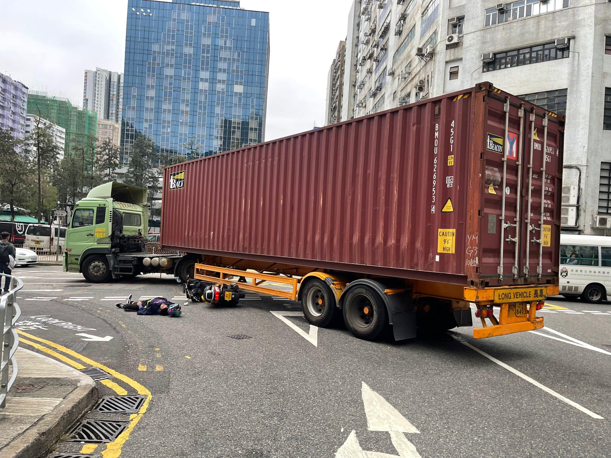 據網傳事發一刻車Cam片段,涉事貨櫃車左轉入穗禾路時,貨櫃拖架撞及停在旁邊的電單車,電單車向左翻側,鐵騎士倒地受傷。