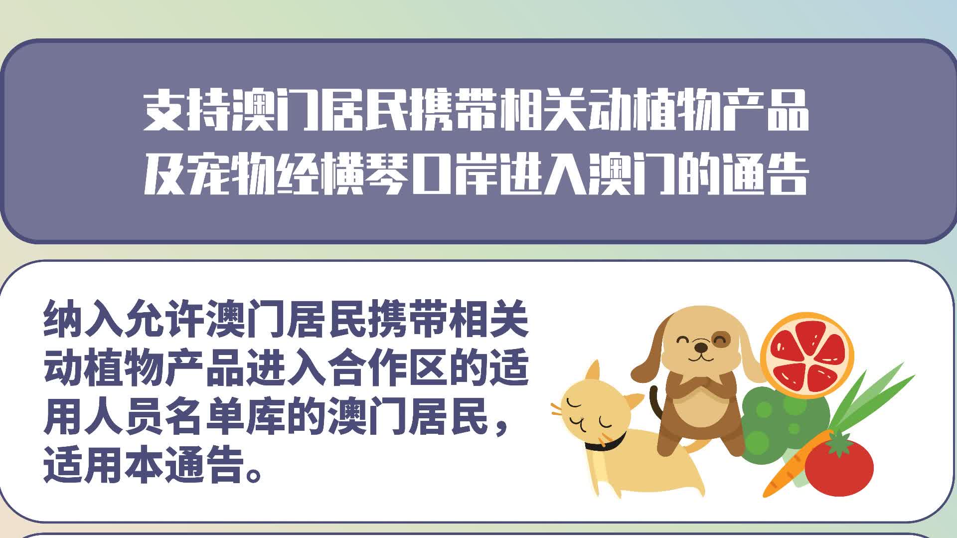 (大公文匯網 記者 方俊明)記者今天(27日)從橫琴粵澳深度合作區法律事務局獲悉,《關於支持澳門居民攜帶相關動植物產品及寵物經橫琴口岸進入澳門的通告》(以下簡稱《通告》)發布,明確自3月1日起,納入允許攜帶相關動植物產品進入橫琴粵澳深度合作區(以下簡稱合作區)的適用人員名單庫的澳門居民,可攜帶相關動植物產品及寵物(僅限犬、貓)經橫琴口岸進入澳門。