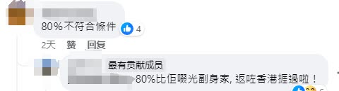 誰知,評論區網民大潑冷水,留言指「80%不符合條件」、「80%比佢啜光副身家,返咗香港啦!」↓