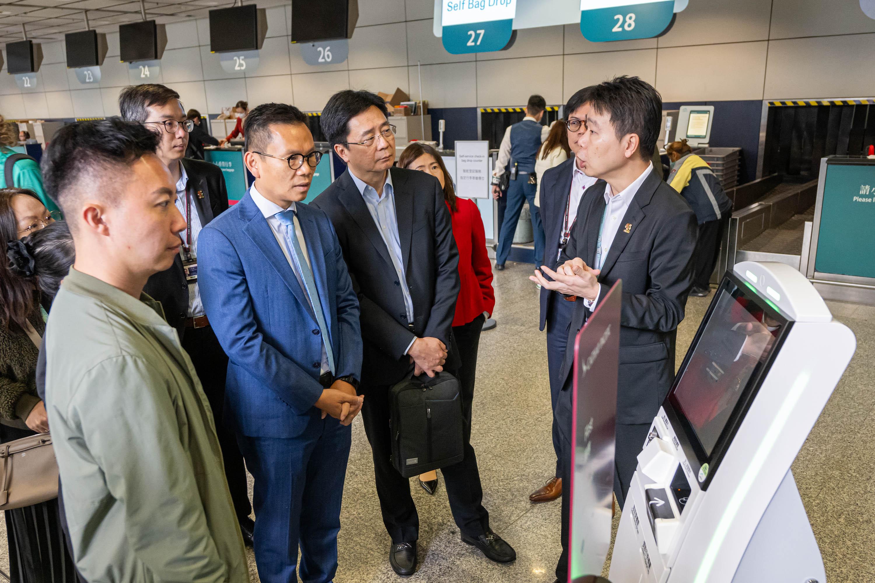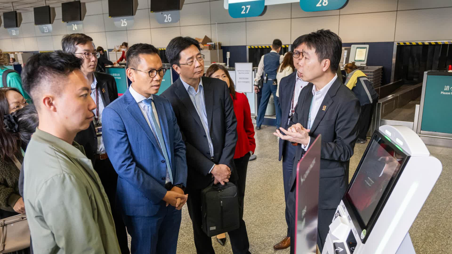 議員其後參觀香港站於本月1日起引入的4個自助行李託運櫃枱,該設施配合智能登記櫃枱,提供一條龍智能自助服務。乘客在網上完成預辦登機手續後,可到智能登記櫃枱打印登機證及託運行李標籤,然後到自助行李託運櫃枱託運行李。