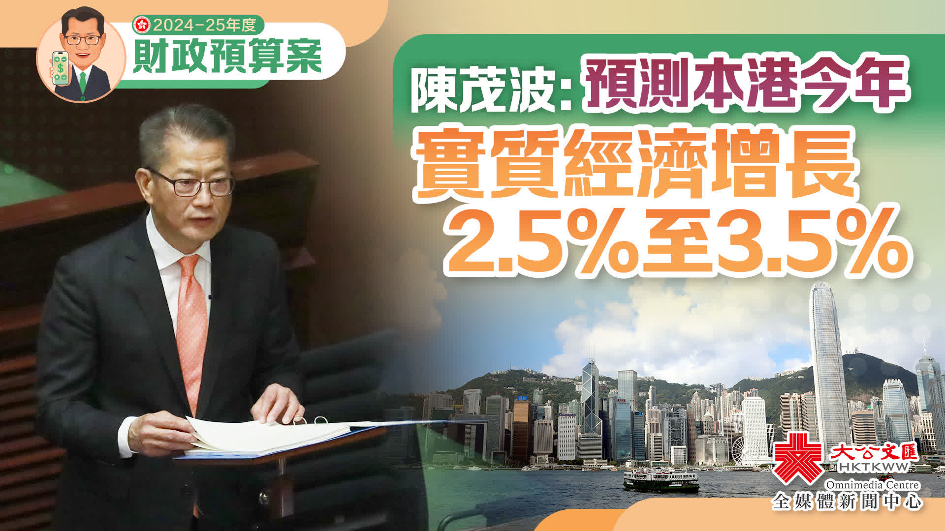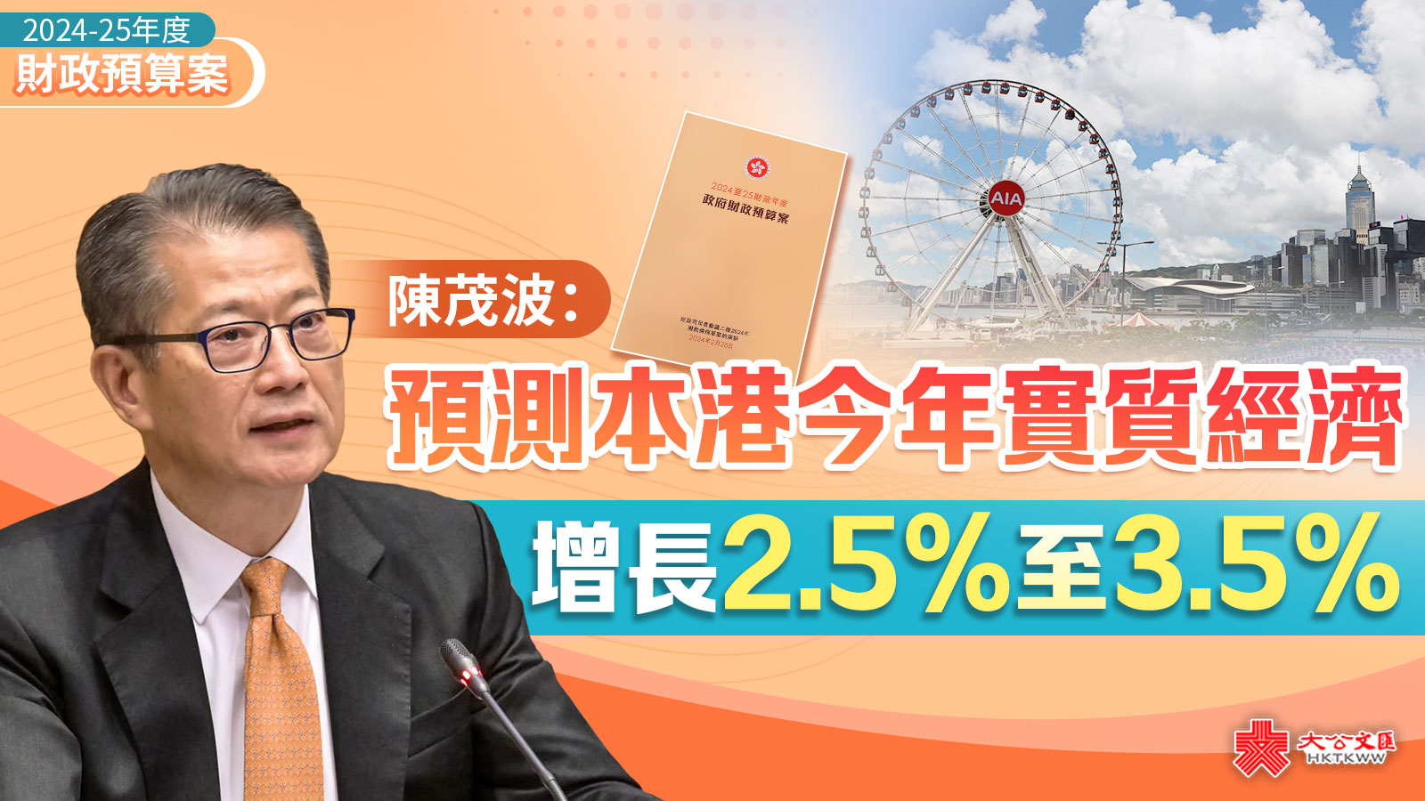大公文匯全媒體報道,財政司司長陳茂波今日(28日)發表2024至25年度《財政預算案》。陳茂波預測香港經濟在今年會進一步擴張,全年實質增長介乎2.5%至3.5%。