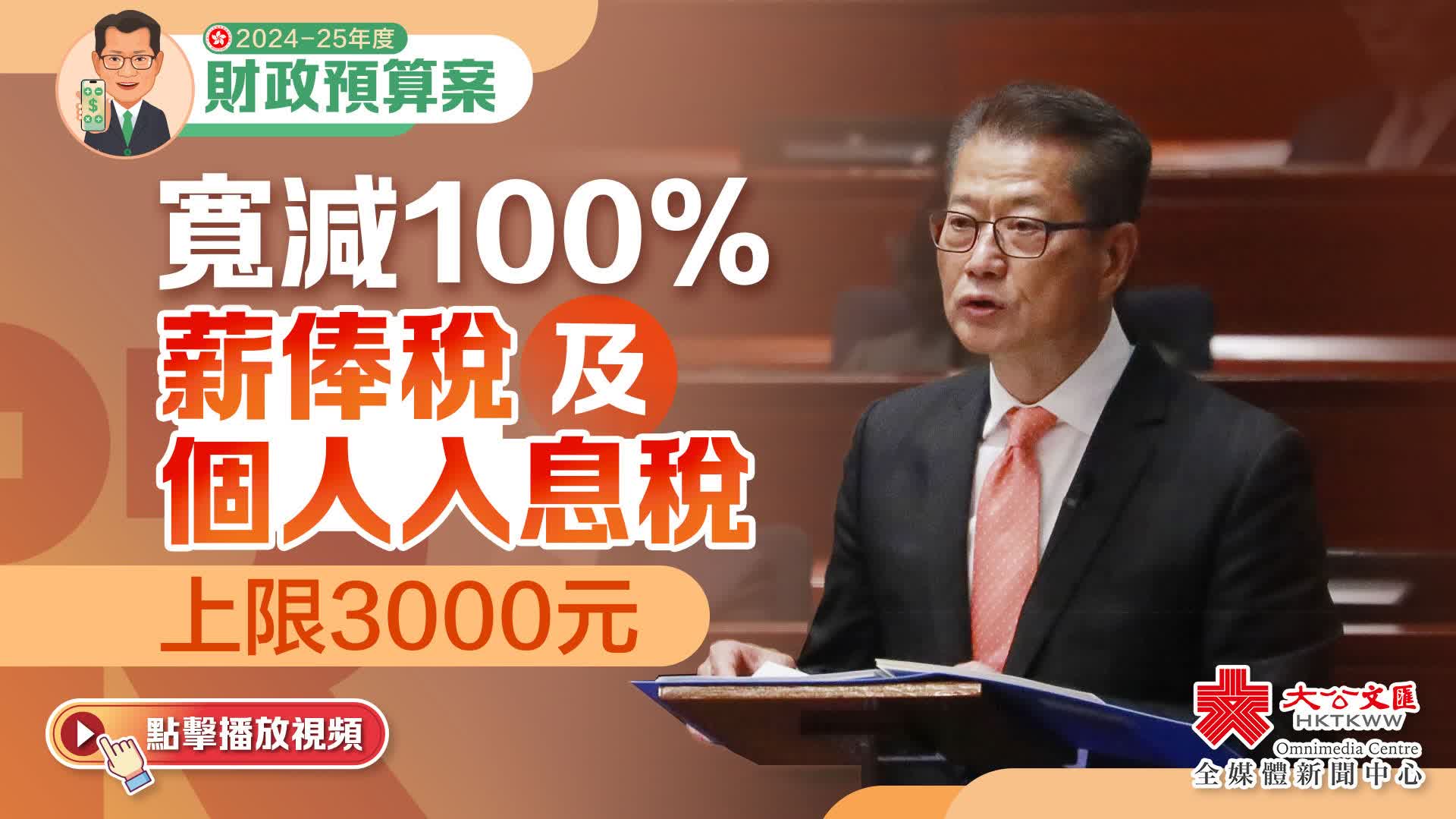 大公文匯全媒體報道,財政司司長陳茂波今日(28日)發表2024至25年度《財政預算案》。陳茂波宣布,考慮到部分行業和市民仍面對經濟壓力,以及政府今年的財政狀況,將繼續寬減住宅及非住宅物業差餉,以每戶1000元為上限。另外,寬減2023/24課稅年度百分之百的薪俸稅和個人入息課稅,但金額就較上年減少一半,上限為3000元。